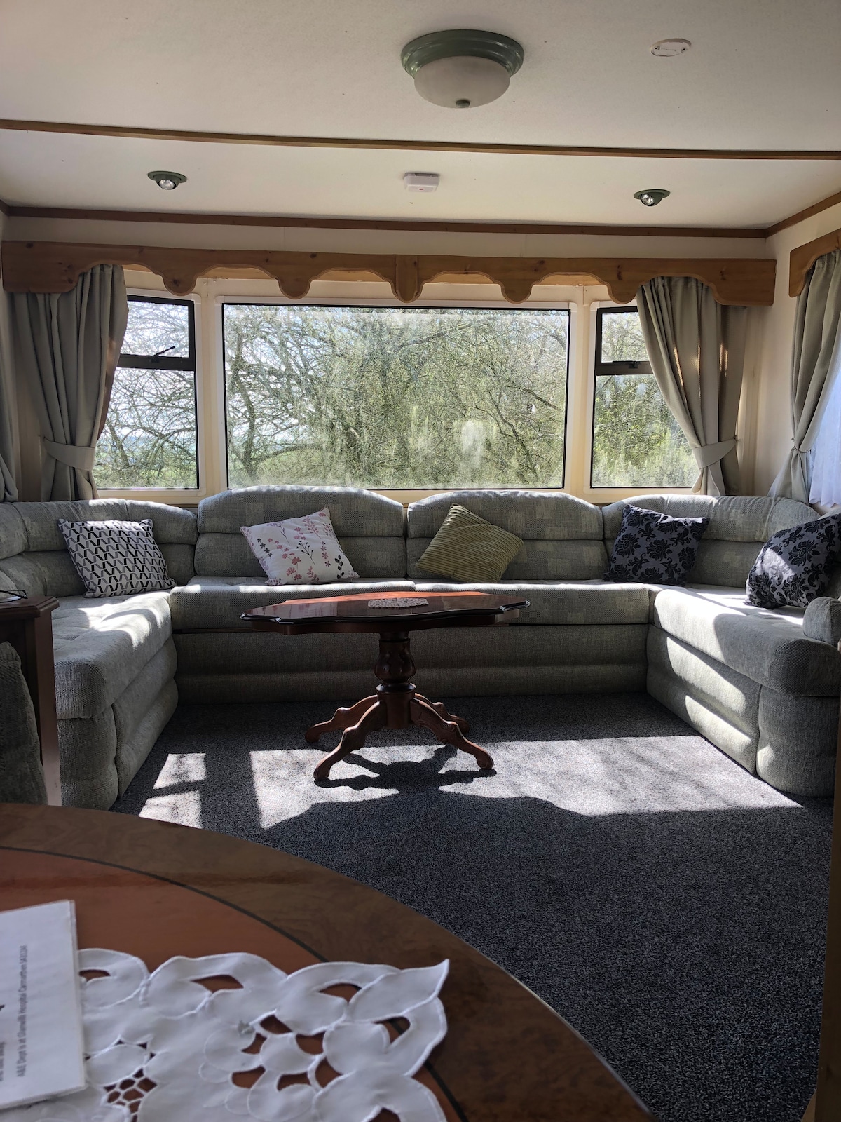 static caravan sleeps 6 one double bed and two singles and a pull out double in the lounge, bathroom, nice size kitchen and separate dining area- we live on a working small holding just outside Carmarthen where we raise and keep goats, pigs chickens, turkeys and 2 ponies, and Large decking area outside caravan to enjoy the stunning views Near by is some amazing coastlines including Pembrey countrypark and beach, Llansteffan3 miles away and oakwood theme park just 40 mins drive .Min 4 night stay.