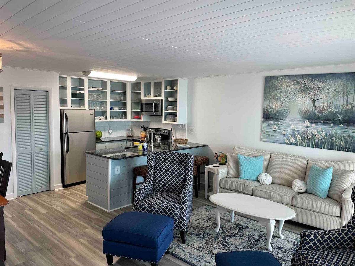 My team hosts with the most, and we want to make your stay is perfection! This space is absolutely perfect for a couple and 1 maybe 2 more when needed. With ocean and canal views in the heart of Carolina Beach this little gem comes with a full service kitchen, a nice sized bathtub, and a king size bed! The ottoman in the living area converts to a comfortable twin size bed. Beach access being just a few steps away. 5 minute walk to the CB boardwalk.