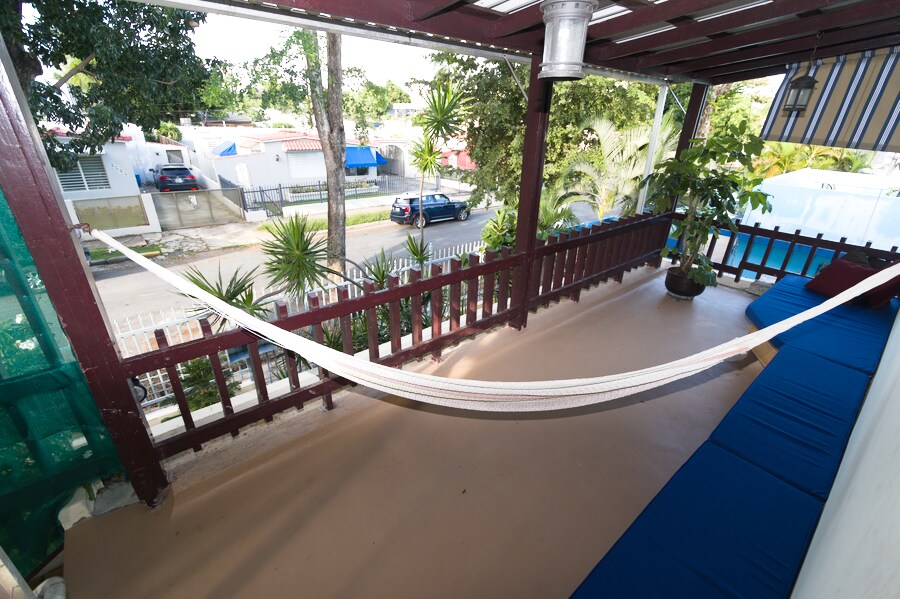 Power Generator/cistern. Ground floor private unit. Relax in this boho unit, surrounded by lush gardens and tropical trees. 5 min driving to the airport, close enough for a quick transfer but located in a dead end, quiet street; 5 min walking to beach; 10 min driving to Old San Juan.Parking in front of property. Near recreational park, tennis and basketball court. Queen bed, TV, coffee maker, fridge, microwave, single stove top, Wi-Fi, beach chairs, towels, umbrella, & table games.