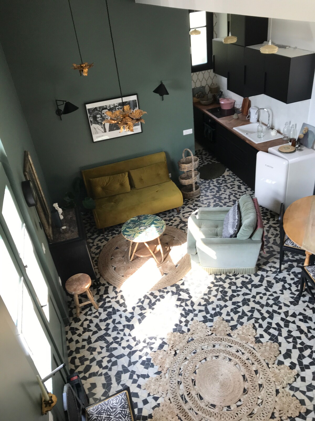 The housing «Jade» is a cocoon of 23m², quiet, soft and colorful decoration, and located in a neighborhood where you will feel safe. Housing completely independent of a house in which we live, it is located 5 minutes walk from the station of Houilles. The apartment, with a ceiling height of 2m10, is composed of three rooms well proportioned : a sitting area and a fully equipped kitchen in the same volume, a bedroom, and a bathroom.