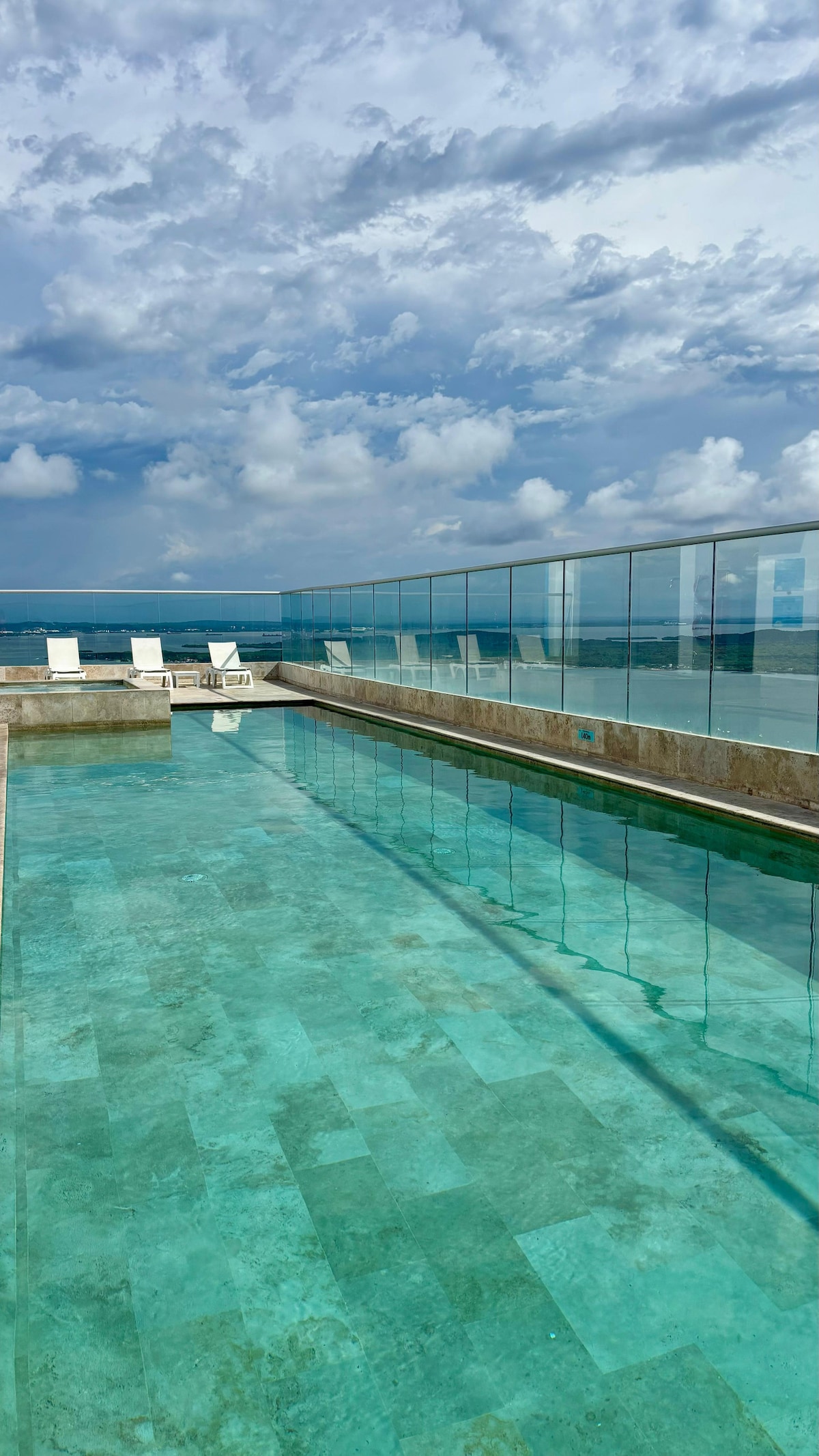 Beautiful apartment on the 34th floor of one of the most prestigious building in Cartagena. 1 bedroom with 1 full size bed, 2 full bathrooms. Fully equipped kitchen, dining room area, private jacuzzi on balcony overlooking the ocean and Tierrabomba island. Spectacular view! Beach two blocks away. Restaurant walking distance. Rooftop with pool and jacuzzi, and another pool on the first floor both overlooking the sea.