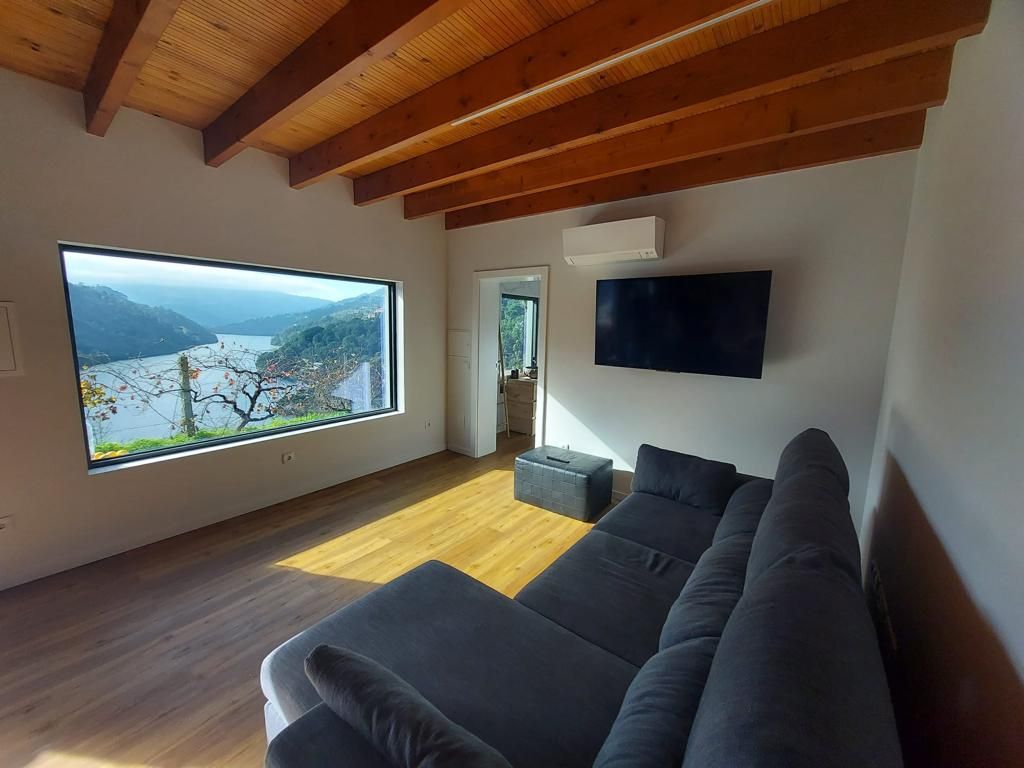 House with 2 bedrooms and a living room ideal for families, overlooking the Douro River. Good solar lighting, equipped kitchen, living room with TV and playstation and covered terrace for meals and leisure. The house is located on a farm with vineyards, fruit trees, aromatic herbs and a vegetable garden. On the farm, there is an infinity pool and a tree house that delights children. Nearby is the House of Eça de Queiroz, the Paths of Jacinto, the Arêgos Thermal Baths and the Douro River.
