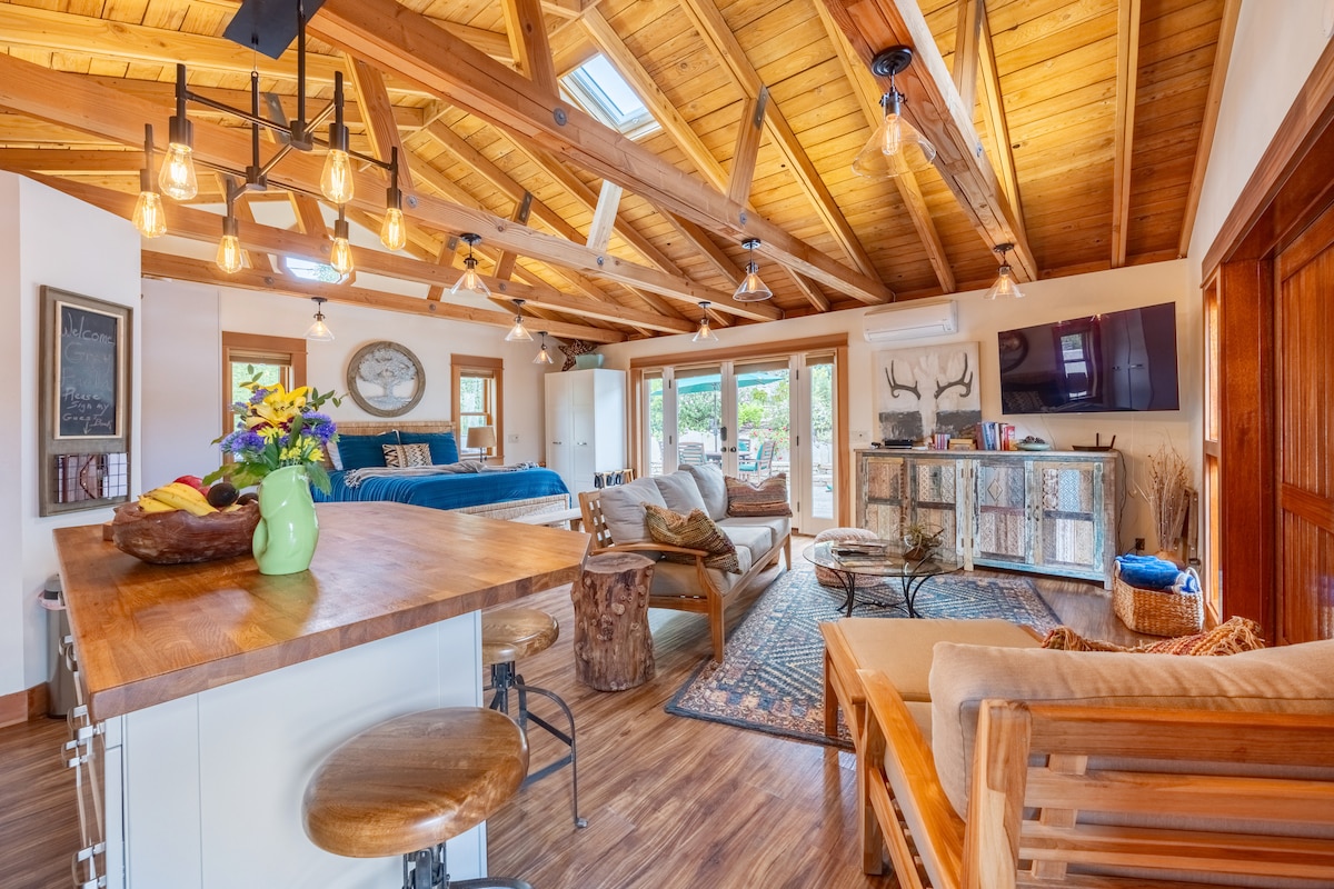 Da Hui Hut is a very private oasis uniquely situated at the top of San Diego county's magnificent Mt. Helix. At roughly 1,300 feet above sea level, Mt. Helix is the crown jewel of natural landmarks in the area. The landscape provides bountiful views, and the large deck is positioned perfectly to see it all. It feels like you're on top of the city! Inside, guests will encounter Californian and Hawaiian inspired decor as they collide with wooden walls to compose a symphony of color and good vibes.