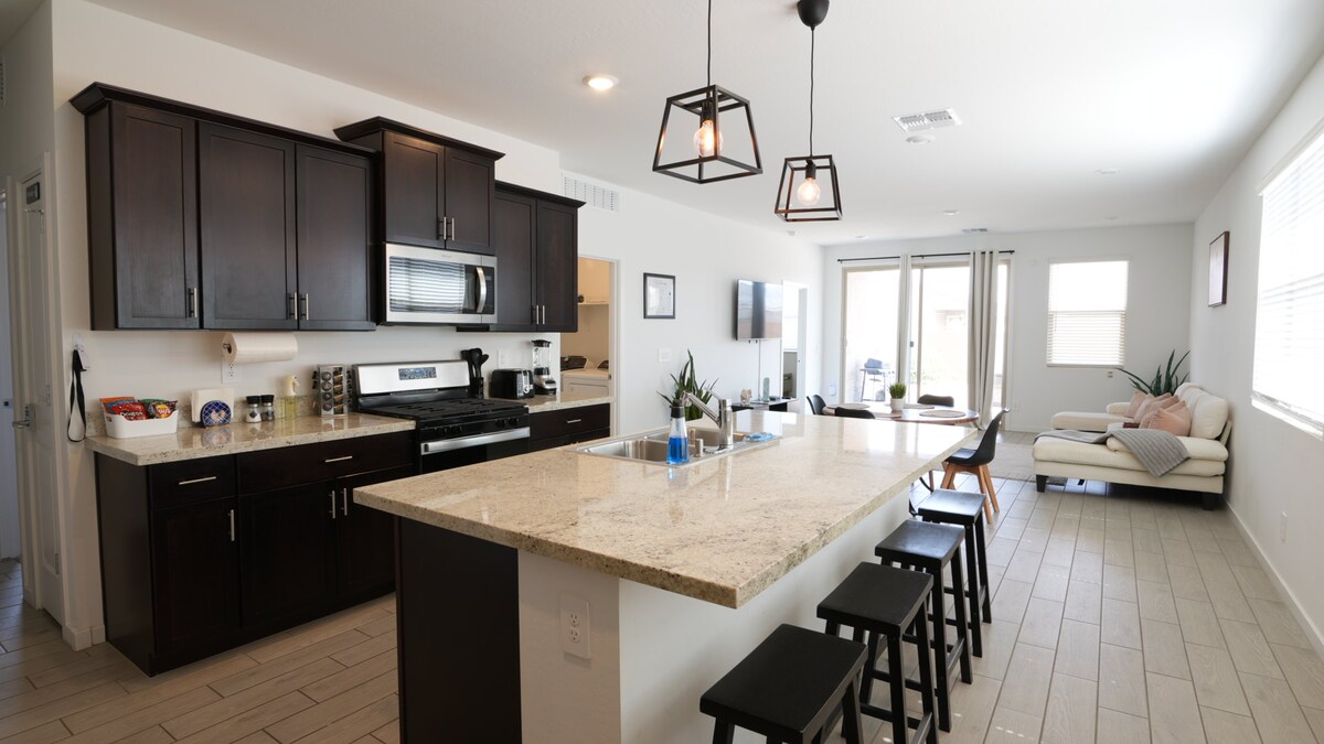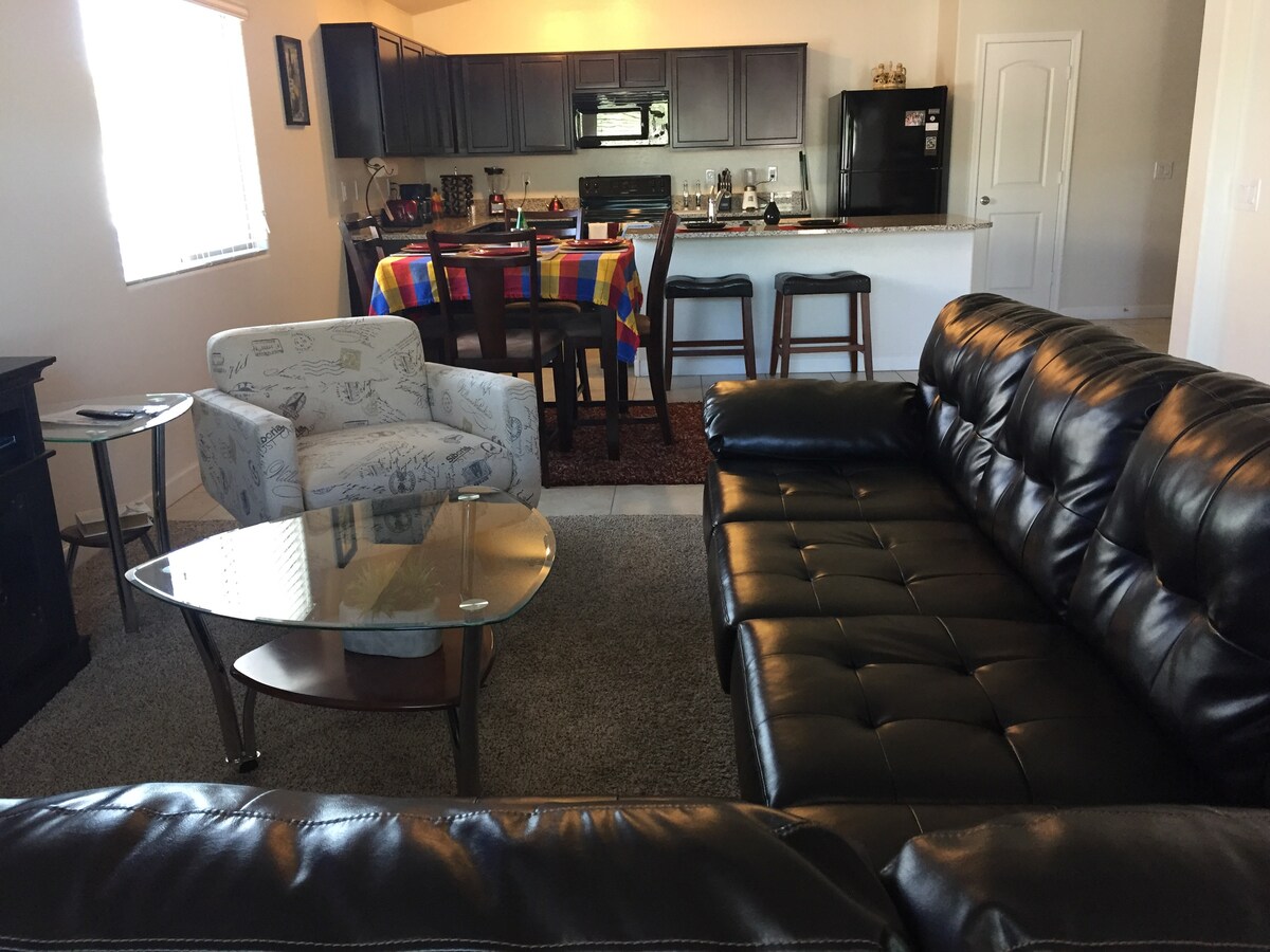 This is a beautiful newly built home. It is spacious with nearby amenities for over night stays. Located in a quiet neighborhood. Enjoy a relaxing stay, complete with a 70in flat screen tv, game consoles , Apple TV entertainment and in home bar all along following the no parties or large gatherings and events policy. Book now. It'll be your most relaxing stay in Casa Grande.