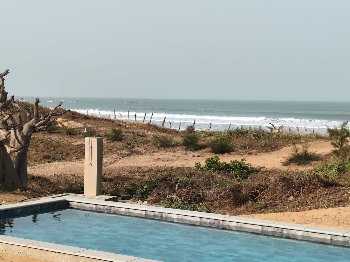 A 4.6kms du centre du Cap Skirring, villa pieds dans l'eau avec piscine, océan et nature, pour 6 adultes, 3 chambres, 3 lits (1 king,2 queen, 1 lit parapluie bb) 4sdb, dressings,wifi, parc d'1 hect en terrain plat, accès privatif à plage, literie parfaite contre maux de dos, calme et à l'abris des regards+plage "privée". Villa entièrement équipée. Personnel sur place, Chef, masseuse,baby-sitter sur demande.8 ans d'expérience en accueil voyageurs.Possibilité de privatiser le domaine pour 11 pers