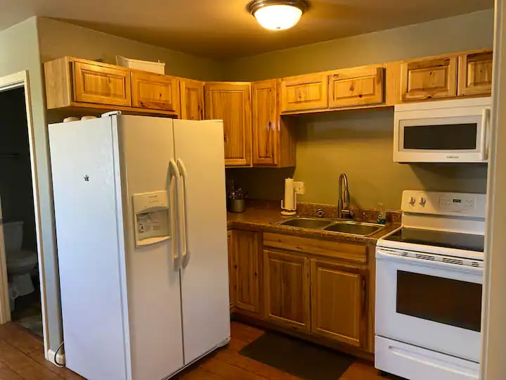 This unique place has a style all its own. Updated studio, built in blue stain bed frame , vaulted main area , cute kitchen , nice bathroom with laundry in it , L shaped sectional in living area and tv, wifi and driveway parking There are 4 pictures hung in the unit , they are newspapers we found in the walls during the remodel dating back to 1939. We do accept pets, 2 max no exceptions, there is a fee If you want to book out further then 3 months for 7 days or longer just message Me