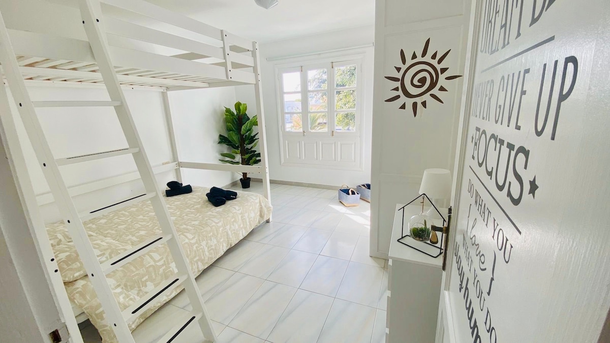 Very bright apartment with Wi-Fi, SmartTV (Netflix and Primer Video), in one of the best areas of Corralejo, in the center. All restaurants are within walking distance, Hiperdino is just around the corner, post office, banks, bazaar, printing shops to print documents, gas station, cafes, playground, soccer field, no need to take the car at all, there is even a small beach just 100 m away. Spacious, clean house, 1 sofa bed, large shower, 2 140 cm double beds in bunk beds with TV.