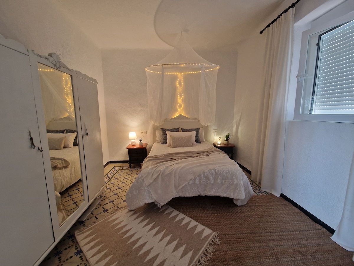 Duplex built on the natural rock of Salobrena, located in a quiet cul-de-sac in the old town. Accessible by car to the front door. Independent entrance at street level. Bright & peaceful. Combines modern comforts with vintage furniture & local character. Fully equipped kitchen, HVAC + fibre optic WiFi + smartTV. 10 minute walk to the beach. The perfect base to explore the area, relax or work from home. Andalusian Tourist Registry: VUT/GR/00159