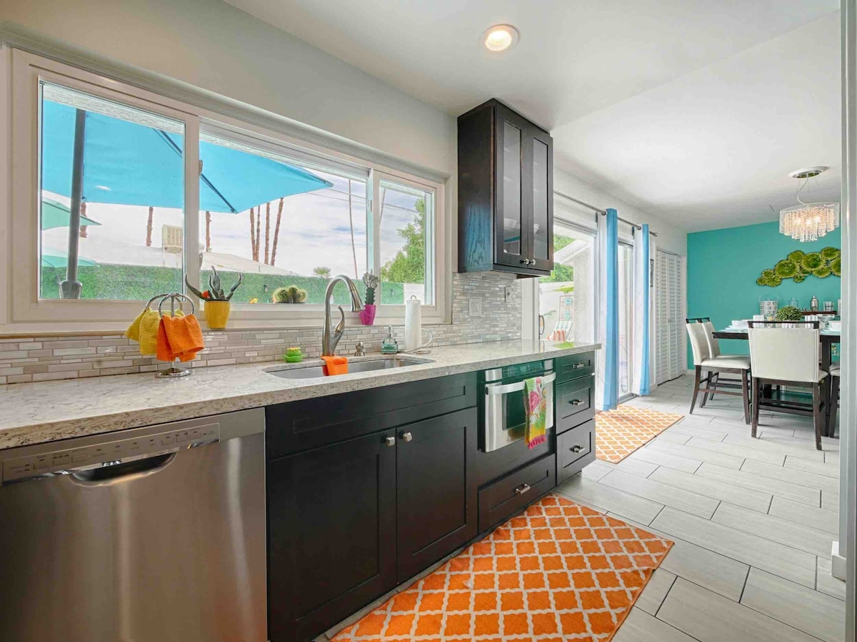 Welcome! Just bring your toothbrush & play your music through the home sound system. 4 bed/2 bath Mountain View Home in south Palm Springs. Minutes to downtown eateries. Parker, Kimpton,Ace & Saguaro hotels for a drink or five. Master w/en-suite. Toss some steaks on the BBQ & dine al fresco pool side or under the cabana. Kitchen has 6 burner gas stove,utensils,spices,coffee etc. 100% cotton bedding & towels. Airbnb does not add 11.5% city tax. 28 days exempt. Pool heating $75 a day TOT#3753