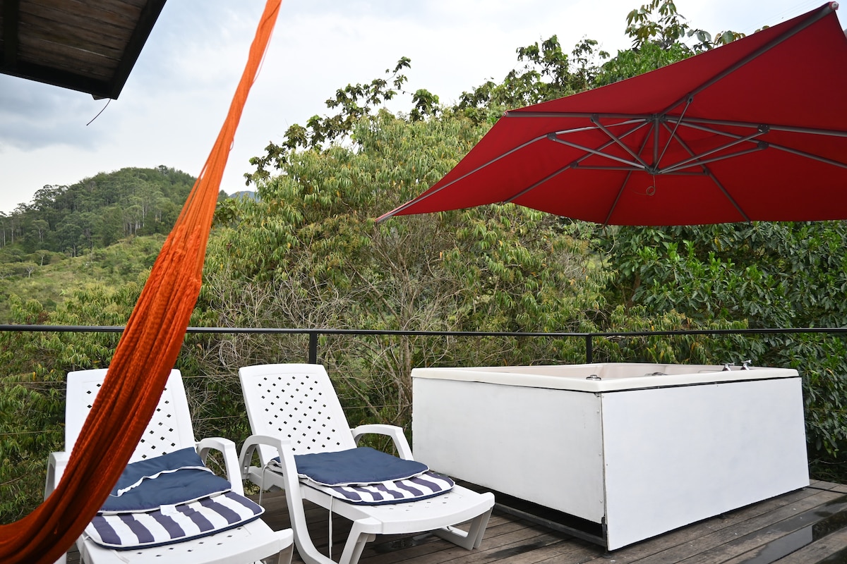 Disfruta del encantador entorno de este romántico lugar en la naturaleza. Mágica y glamorosa experiencia, a 15 minutos del centro histórico de la ciudad de Popayán, Km 4 vía a Termales de Coconuco. Hermosa vista hacia un paisaje cafetero, bosque, sonido del agua y aves. Equipado con Jacuzzi, malla catamarán, ducha de lujo, cava de vinos, baño privado, cama Queen y lencería de lujo, desayunos NO incluidos. Servicio de restaurante y pizzería.