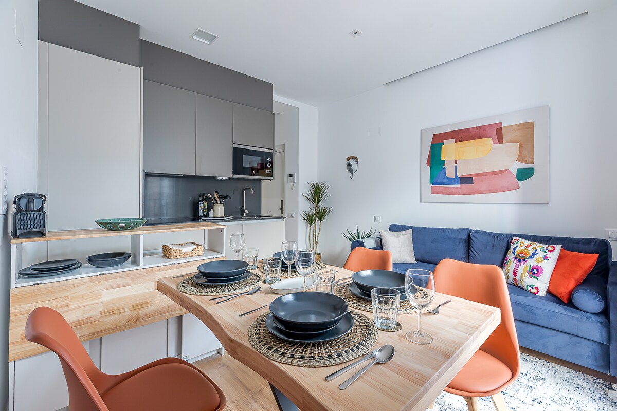 Magnificent 45 square meter apartment in the heart of Madrid. With spectacular design and decoration, spacious areas, and high ceilings, the apartment is equipped with everything you need for your stay in Madrid. The living room has three balconies overlooking the street that provide great brightness to the flat. The bedroom has an en-suite bathroom and a work desk. From the apartment, you can walk to almost all the iconic points of Madrid.