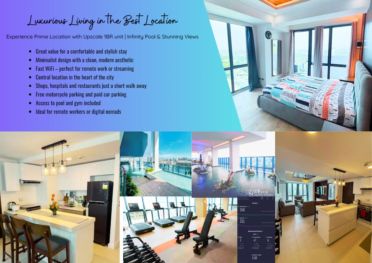 Greet the day with awe-inspiring vistas at our Grand Residences Cebu studio. Revel in comforts like a plush queen bed, Netflix, and high-speed 400Mbps fibre Wi-Fi. Dive into the stunning pool, stay fit in the gym, and relax on the 360-sky deck. This modern condo features a cozy and stylish interior , multiple communal living spaces, and concierge service for a flawless check-in. Stroll to Ayala mall and IT park. Experience the best of city living – book your stay now! No parking Available