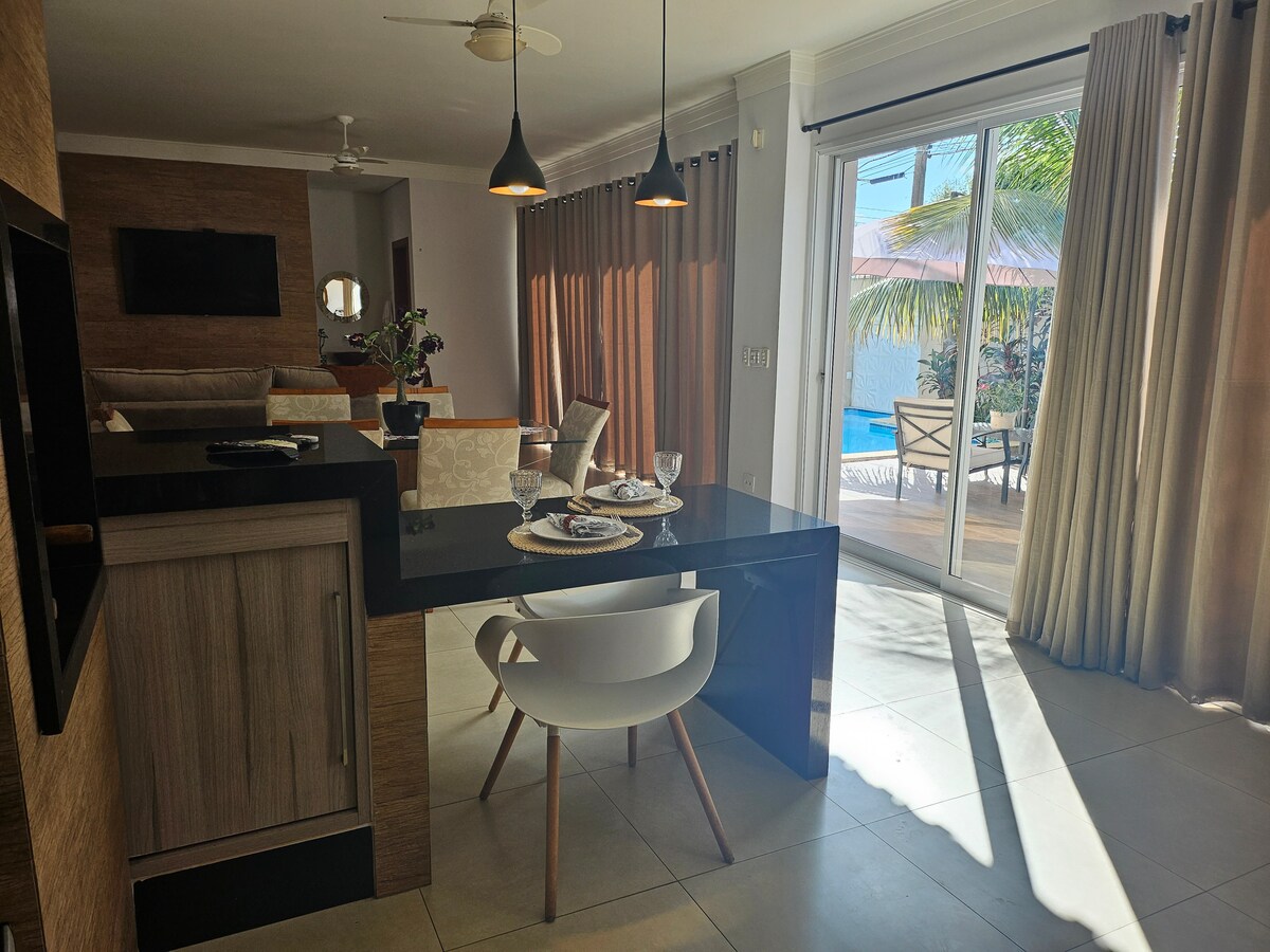 Great house for leisure and accommodation with flexible check-in, containing two bedrooms, one being an en-suite with air-conditioning and fans, a living room with TV, full kitchen, laundry with washing machine, large outdoor area with swimming pool, barbecue area, freezer, shower, two bathrooms, pool table, fans, covered garage for two vehicles, space protected by electric fence, good location with nearby shops,