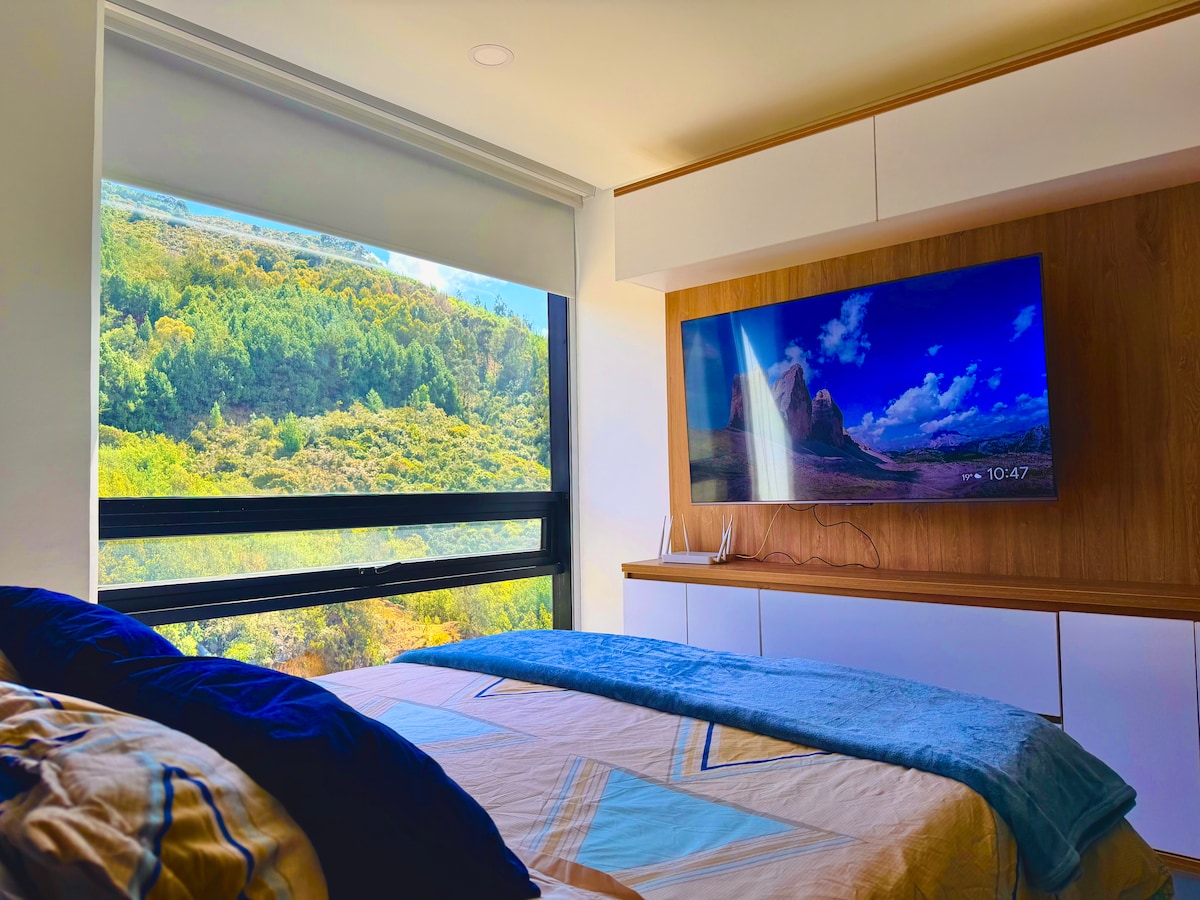 The Sky is a duplex studio apartment ideal for those looking for design, tranquility and comfort in Bogotá. Its mezzanine-style architecture, contemporary finishes, and a floor-to-ceiling window fill the space with natural light and create a modern and cozy atmosphere overlooking the mountains. Located in Cedritos, a safe and residential neighborhood, close to cafes, restaurants and parks, with excellent connections. Exclusive benefit: no Airbnb service fee. You pay the total, no hidden fees :)
