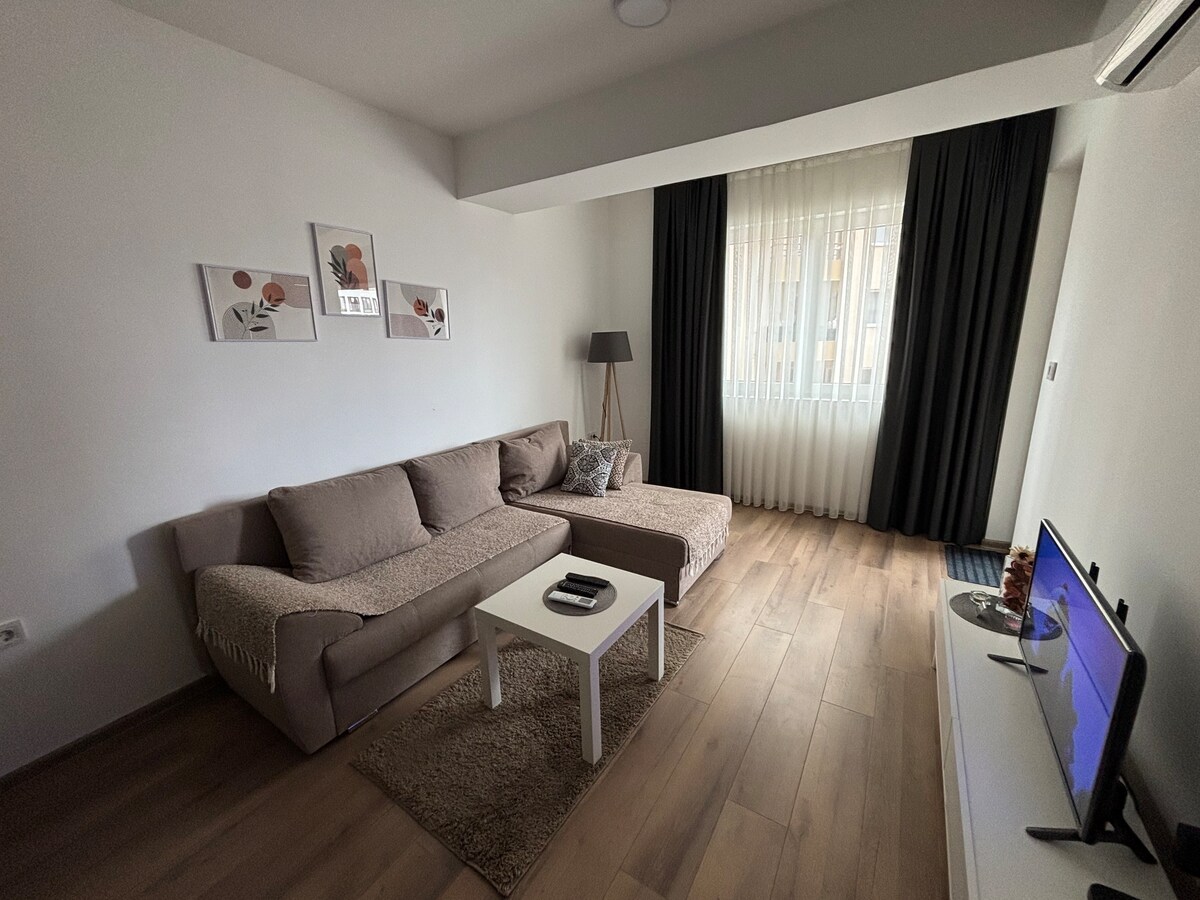 Modern, one-bedroom apartment with balcony, fast Wi-Fi, A/C and free parking. Easy walk to the Main Square, Old Bazaar, malls, cafés & restaurants. Perfect for digital nomads and travelers who can enjoy stylish, clean and peaceful stay! Sleeps 3 (queen + sofa bed), with full kitchen (oven, stove & dishwasher), bathroom (shower, washing machine, towels) and balcony. ✈️ We offer airport transfers for extra comfort (additional cost). Stay 10+ nights get one-way free, 14+ nights both ways free!