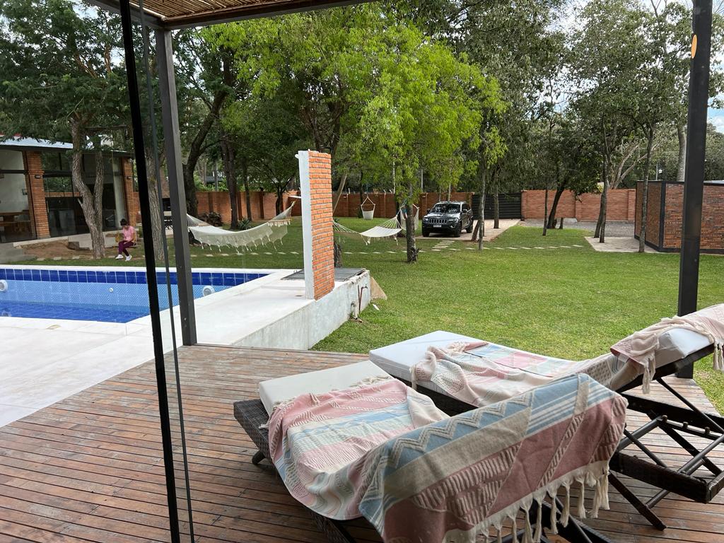 Ideal for relaxing with the whole family and friends in this quiet place surrounded by green areas. - Ground floor: It has a swimming pool, jacuzzi, open quincho, grills, fireplaces, a large patio, tatacuá, two bathrooms and the social area integrated into the kitchen/dining room. - Upper floor: it has two bedrooms, one with a double bed (plus an additional one), the other has 2 twin beds (plus 2 additional ones), and a shared bathroom. Only 200 meters from the Country Club SB. Road to Pirayu'i.