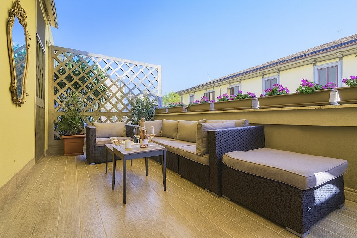 Experience the Milanese spirit in this amazing penthouse with contemporary lines and fine materials, equipped with a STEAM ROOM and a huge terrace overlooking the Milan skyline 360 view. The penthouse has a living room, a kitchen, 2 double suites each with en suite bathroom and kingsize beds as well as 2 foldaway single beds in living room and a 3th bathroom. In the terrace there is jacuzzi tub, available from 4/1 to 10/31, on request (at least 24h before check in) with extra cost, paying garage
