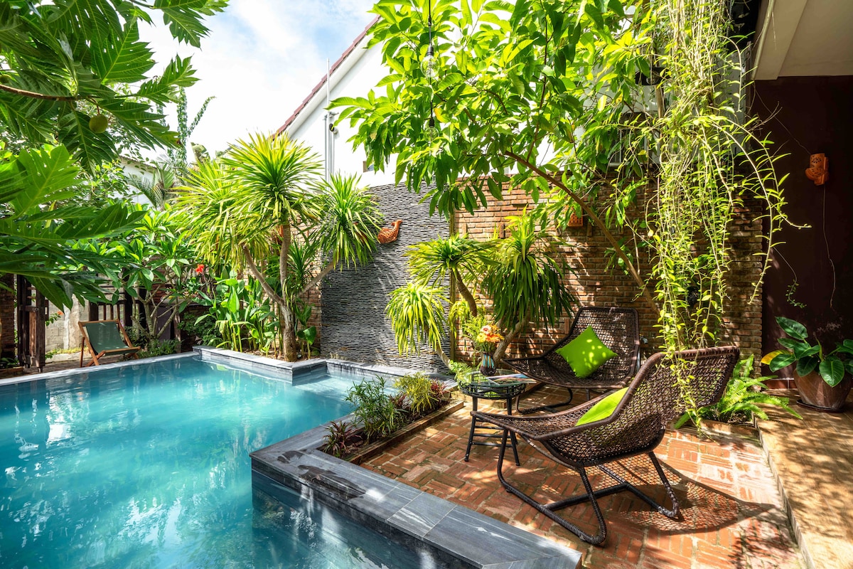 🎁 A newly built villa just 3 minutes’ walk to both Cua Dai Beach and Thu Bon River, offering a rare blend of privacy, wellness, and coastal charm. Enjoy a private pool, beach yoga, and walkable access to local restaurants and spas. With 3 serene bedrooms (2 king beds + 2 singles), it comfortably hosts 6 adults + 2 kids (under 6) — perfect for families seeking space, relaxation, and meaningful connection in a refined, tranquil setting.