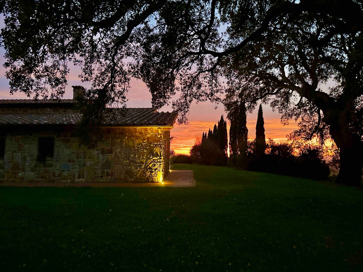 This beautiful sheepherder’s stone cottage is equipped with modern comforts and spa facilities free of charge. The large grounds of forest and meadow span a ridge and provide panoramic views of the valley toward Val d’Orcia to the north, the expansive Maremema to the south, and the ancient volcano of Amiata to the west. This is the perfect getaway for those wanting a private retreat from which to explore the rich wine, food, culture, history, and landscape of southern Tuscany.