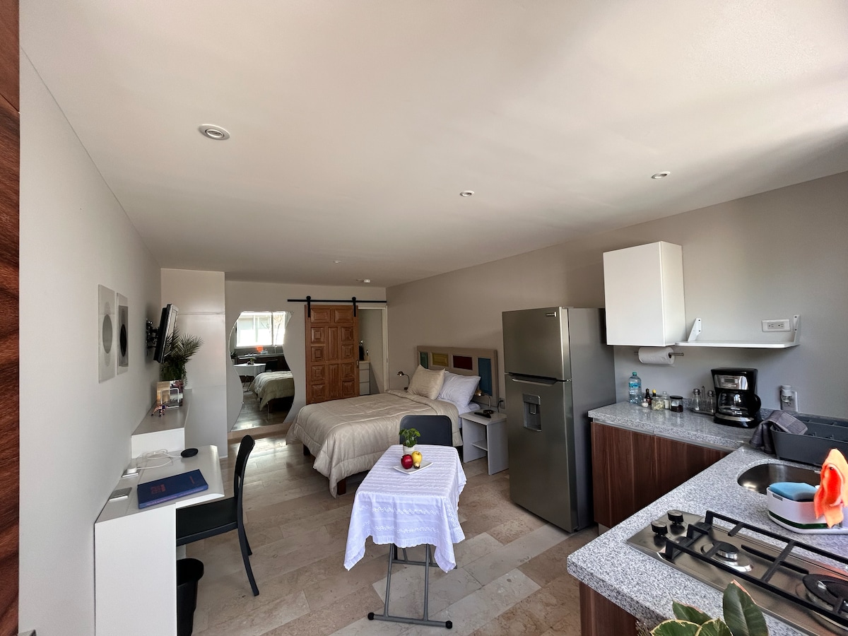 Cozy studio with separate entrance for 2 people, kitchen, bathroom, breakfast bar. SmartTV and high speed WiFi. 15 minutes from the airport. On a quiet, cozy street with easy access by car or public transport (4 blocks from the Balbuena metro). Great location, we are 10 minutes from the Palacio de lo Deportes, Autodromo Hermanos Rodriguez, Foro Sol, TAPO bus terminal. And a 20-minute drive to the Historic Center.