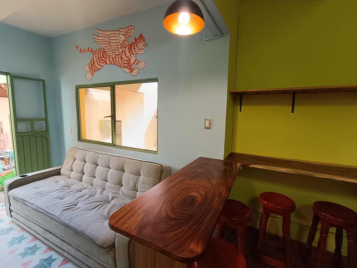 Magnífico Depa recién remodelado estilo Vintage Contemporáneo de 55m2 en 2 niveles. Ubicación céntrica, a 1km del Parque Alameda. En Planta Baja se encuentra la sala-comedor con cocineta (parrilla de inducción, microondas, refrigerador, cafetera y vajilla). En Planta Alta tiene Sala de TV con sofá cama tamaño matrimonial y una Recámara con cama King Size o 2 camas individuales con baño completo impecable. CAPACIDAD: 2 adultos 2 niños. ADULTO EXTRA $180 Check in 14:00 hrs Check out 10:00 hrs