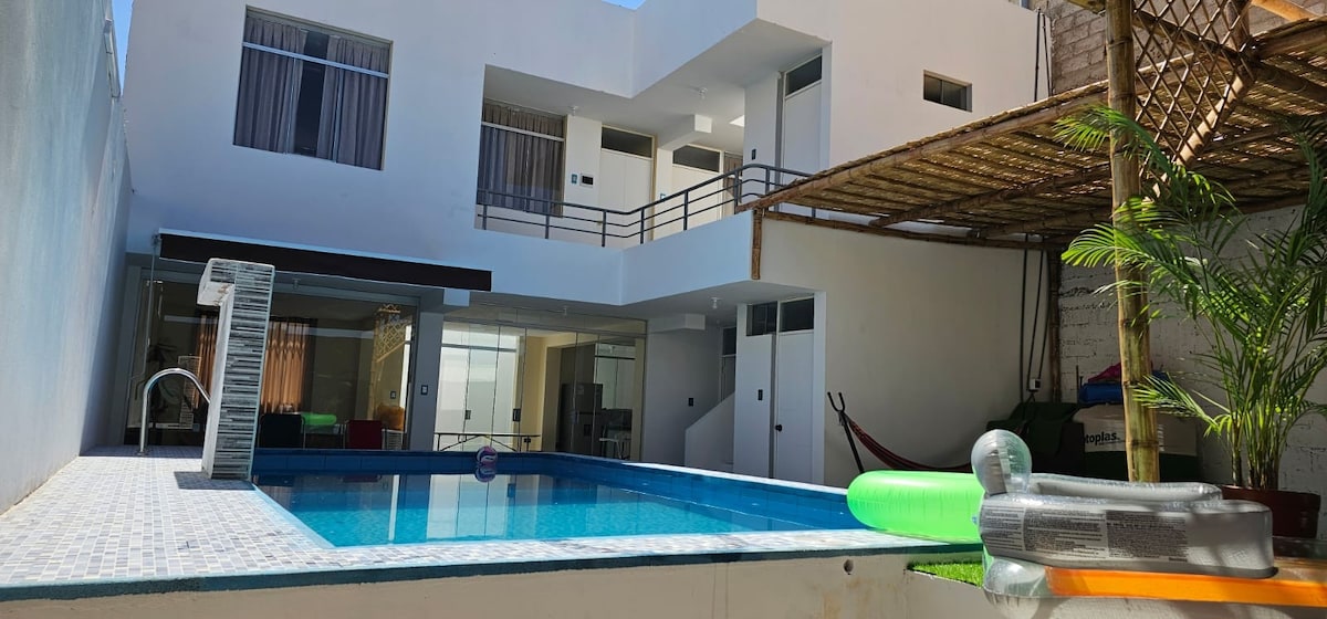 Discover our house with a pool, ideal for families and groups of friends. Equipped kitchen, dining room overlooking the pool, grill area, three bedrooms with bathroom in each room and a social bathroom, garage, drinking water, and security. Convenient location near the beach and Camaná. Book now!