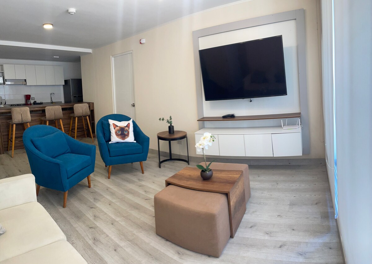 Modern and cozy apartment on the 8th floor, with a nice view from the balcony. Ideal for up to 3 people, with 1 bedroom, open kitchen, mini living room, bathroom and laundry. Fully equipped for a carefree stay. Located in the center, close to clinics, universities and main avenues. The building has elevators, a gym, and common areas. Your perfect base for exploring the white city!