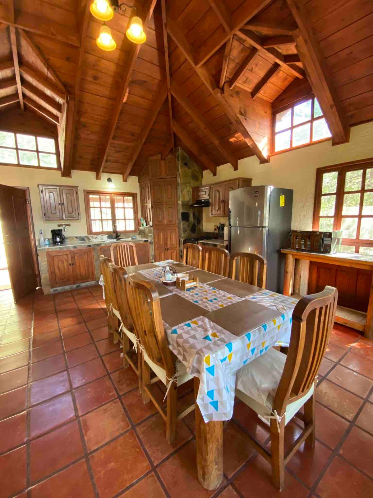 Fully equipped cabin located in the Sierra de Arteaga, beautiful views. It has 3 bedrooms with 4 single beds each, a kitchen equipped with a stove, oven, refrigerator, microwave, breakfast bar, dining room for 8 people, a living room with a fireplace, 2 full bathrooms and a half bathroom in the common area, and a terrace with a spectacular view. It has an outdoor barbecue grill and space to park 3 cars comfortably. We recommend going by van as there is a somewhat complicated stretch of dirt road.
