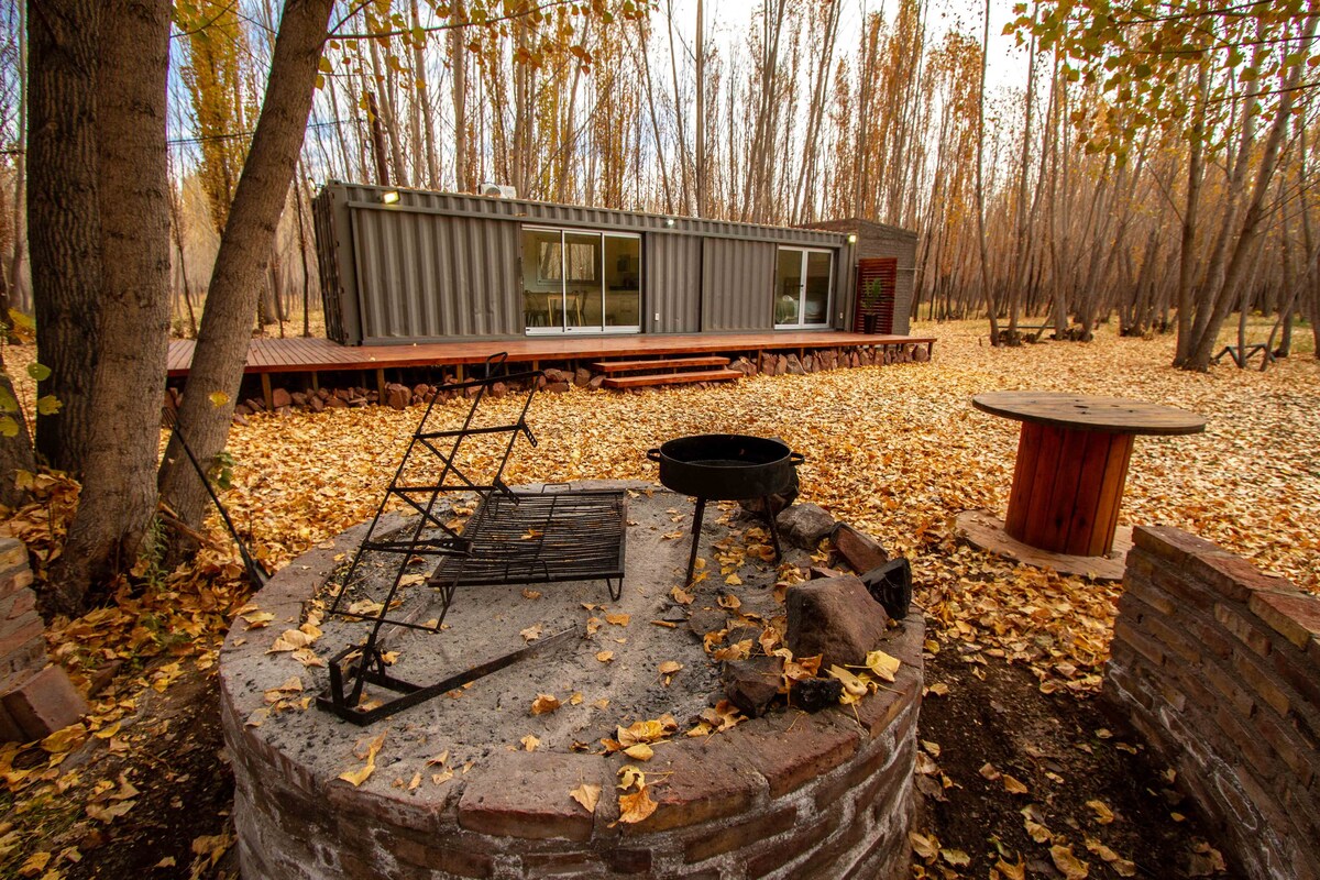 Welcome to your ecological getaway in Uspallata! Charming home-container recycled in the heart of a poplar forest estate. Only 3 km from the center. You will enjoy privacy, tranquility and amazing views. A modern and rustic design in 30m². It has 1 bedroom with double bed, 1 sofa bed in the dining room. Full kitchen, full bathroom, churrasquera, Wi-Fi, TV (with first video, disney+ and paramount) Book now and I had an unforgettable experience in the middle of nature!