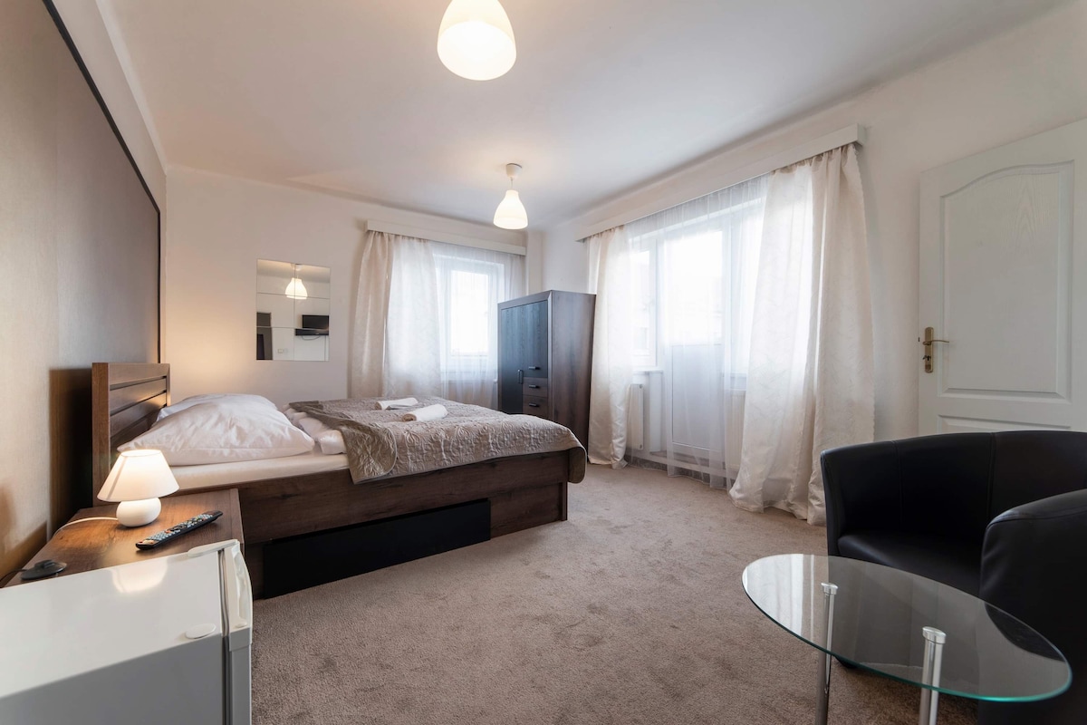 Jedná se o útulný a moderně zařízený studiový apartmán s krbem, plně vybavenou kuchyní, vlastní koupelnou se sprchovým koutem, manželskou postelí a rozkládací pohovkou pro 2 osoby. Od centra města je vzdálen jen 800 m, ale přitom je obklopený zelení. Pro hosty je k dispozici uzavřené parkoviště monitorované kamerami, wi-fi připojení zdarma, nádherný exteriér - zahrady a vlastní volnočasový Ekopark.