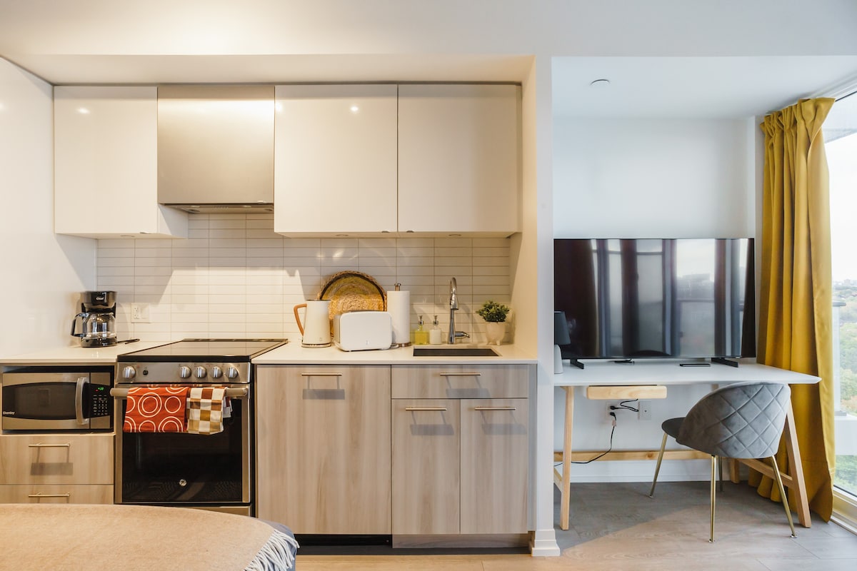 Marvel at the glorious Toronto urban vibes from your room with floor to ceiling panoramic windows. This 1 bedroom condo is professionally designed with modern finishes. You will absolutely love the space we have prepared for you. Relax, unwin,d and enjoy the city views on the private balcony with outdoor furniture. Professionally cleaned after each guest checkout. 100% private and unshared, entire modern condominium unit. Safe, secure, and easy self-check-in procedures with 24/7 security.
