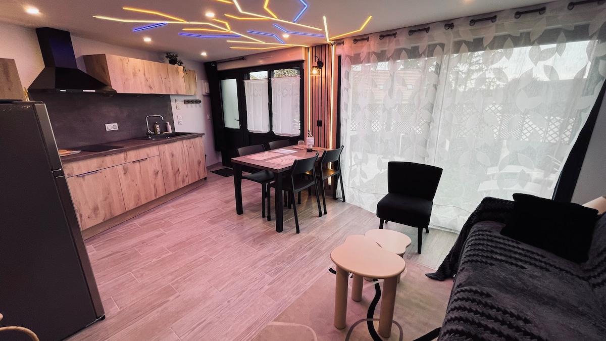 "Lovers' Nest" is the ideal place for couples seeking relaxation and zen. This fully renovated 70 m2 house has been furnished and decorated in natural shades and materials by a decor addict. This cozy cocoon is the perfect place to meet as a couple and have a good time together. The +: jacuzzi, massage room, video projector with home theater Beautiful services, tasteful decor and pretty materials such as polished concrete, linen, organic cotton...