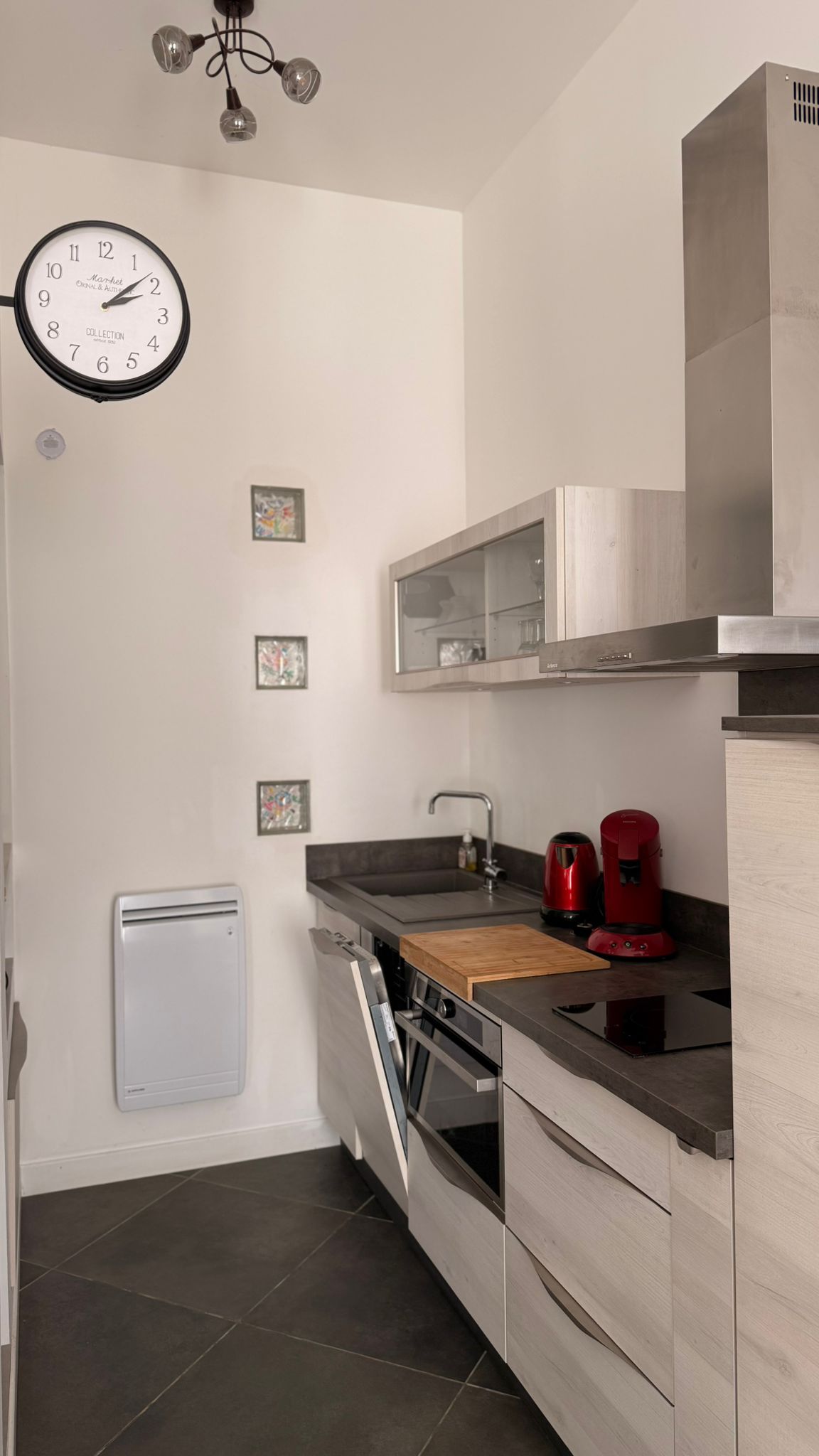 T2 apartment refurbished in 2020 and located on the second floor of a quiet residence, private outdoor parking at the foot of the apartment. Equipped kitchen, bathroom with shower and toilet, 1 bedroom with dressing room, TNT TV and 1 bed 140, balcony, internet TV, internet and free Wi-Fi, dishwasher, washing machine, induction stove, electric oven, microwave, reversible air conditioning. Linens and towels, toiletries and cleaning products.