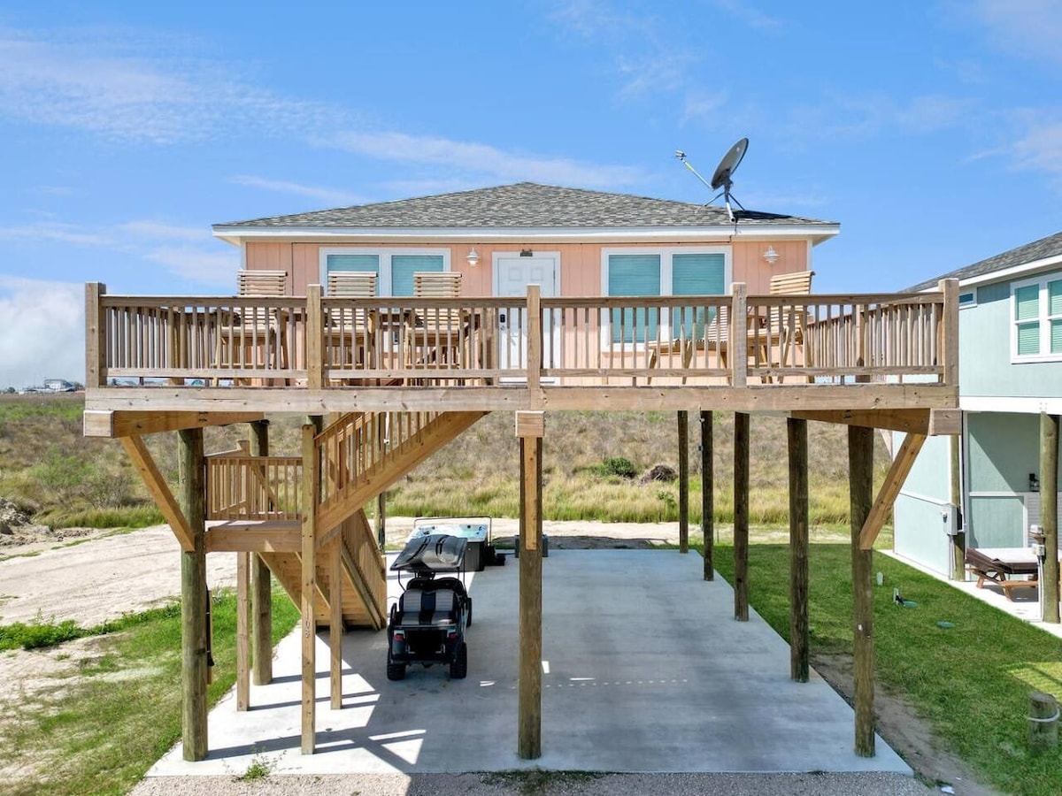 This 5-bedroom waterfront home in Bacliff offers stunning views of Galveston Bay, spacious living areas, and luxury amenities for more than 16 guests. Relax in the hot tub, enjoy the game room with pool and shuffleboard, watch a movie in the movie theatre, or gather on the deck for a BBQ with ocean views. Right in front of the pier, next to Noah’s Ark Restaurant, and just a short drive to Kemah Boardwalk and local attractions. Perfect for family vacations or group getaways.