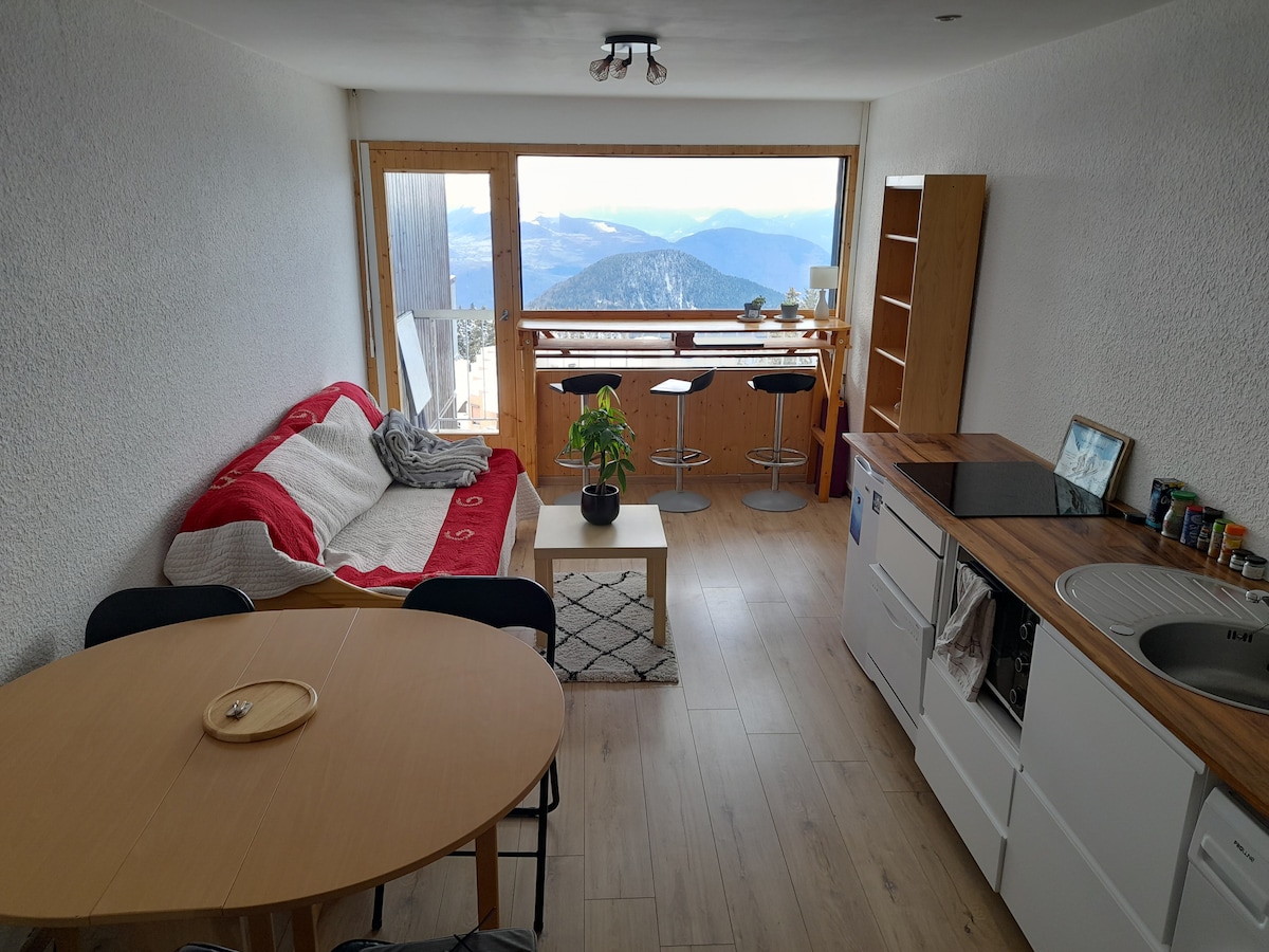 Studio cabine 28 m2 au pied des pistes .Rénové été 2024. Résid Les Carlines(1750), superbe vue sur la vallée, coquet studio idéal pour 4 pers . Chaussez les skis, traversez la route, et accédez au domaine. 4 couch.( 1 lit clic clac et 2 lits superp. dans coin cabine,séparé du salon par 1 rideau), télé, micro-ondes combiné, cafetière ,bouilloire, app à raclette, wc et sdb avec baignoire séparés, coin cuisine..etc. Tarif 300 € la semaine l'été jusqu à 750 € l'hiver. Possibilité we hors vac. sco.