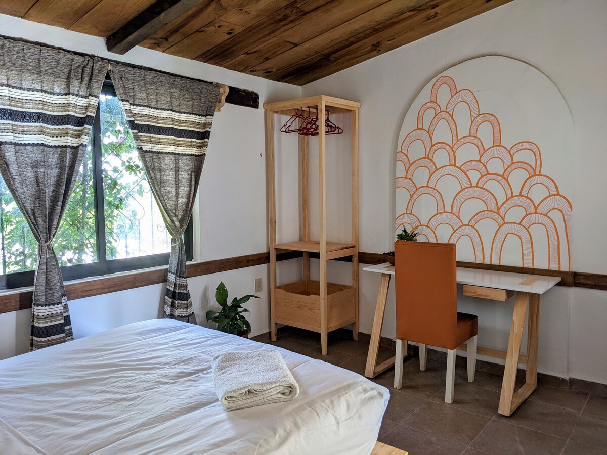 Precioso estudio/cabaña independiente con jardín y patios en el corazón de la ciudad de San Cristóbal de las Casas. El apartamento está ubicado dentro de una propiedad, lejos del ruido. Tiene una habitación con cama y sábanas de alta calidad, un escritorio muy lindo y cómodo, una cocina bien equipada y un baño amplio con agua caliente. Una casita muy tranquila cerca de todos los lugares de interés de la ciudad!