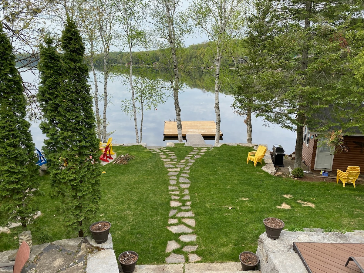 Luxury lakefront cottage. Shallow wade-in water near the shore and deep off the large 20x20ft dock. Custom stone steps will take you down to both the dock and the lake. Large outdoor dining options and many areas to sit and relax. Spacious chef's kitchen. Large indoor wood-burning fireplace, outdoor fire pit, and lots of water toys, including 2 kayaks, 1 canoe and a SUP board. There is also a trampoline for the kids! Fully maintained road makes this a perfect winter getaway location in winter!