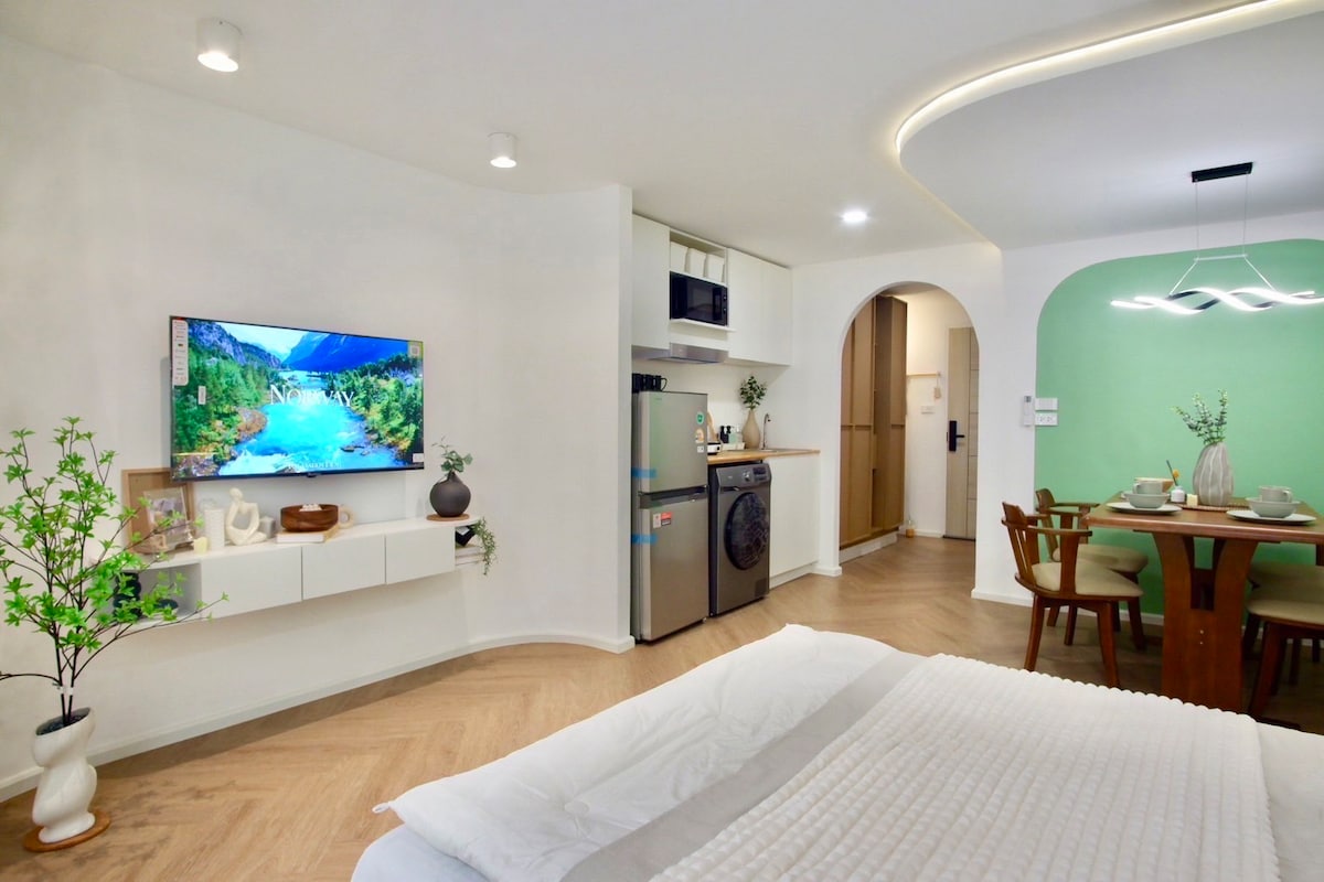 A peaceful and minimal retreat just 15 minutes from downtown Chiang Mai. 🌿 • Bright, cozy space with high-pitched roof and open design • Teak wood furniture and Japanese-inspired simplicity • King-size bed, fast Wi-Fi, and space to relax or work • Ideal for couples, solo travelers, or small families 👉 For 3 guests, a premium mattress with full bedding is set up for a restful sleep (only when booked for 3).