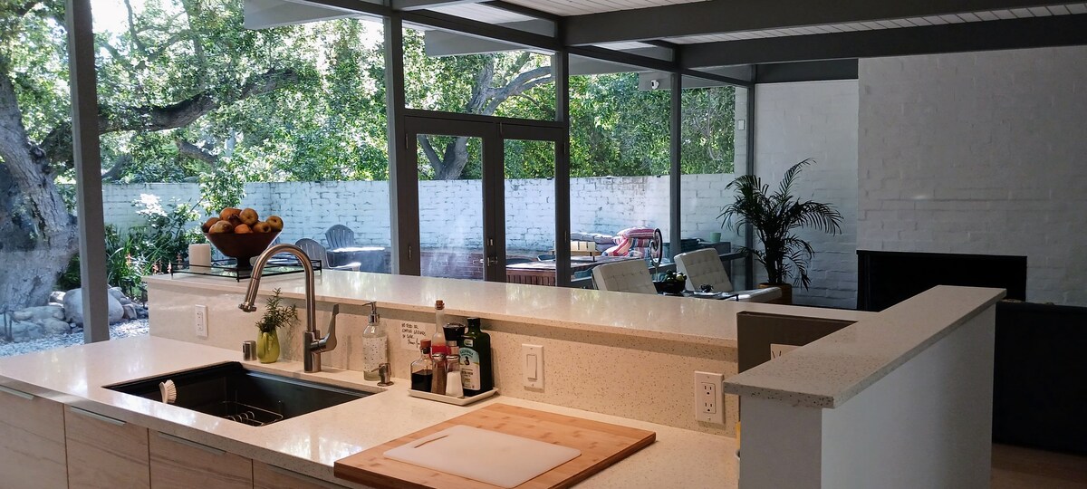 Rest and relax in our restored 1953 architectural gem with high ceilings and walls of glass opening to a private garden and patios under heritage oaks. Peaceful and serene, modern open kitchen, patio, birch floors and designer finishes. Relax under the oaks. Sleeps 4 Venture to nearby beaches from Ventura (20 min away) to Santa Barbara, discovery Old California in citrus and avocado groves of Heritage Valley and Ojai, explore historic Santa Paula. yet only aprx 1 hour from LA.