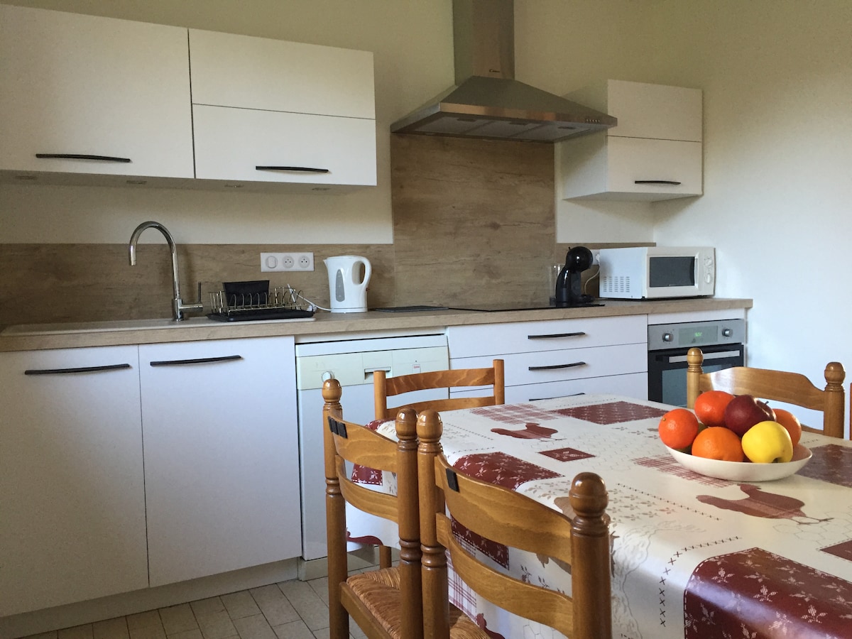 A spacious and serene space. Quiet house fully equipped to accommodate up to 2 adults and 2 children and a baby. Fiber installed. 1 separate bedroom with 160 cm bed (bed linen provided) 1 large living room, fitted kitchen with separate sleeping area: 2 beds of 90 1 bathroom + washing machine + towels provided 2 terraces key handover by the owner on site otherwise key box Dogs allowed €15 extra