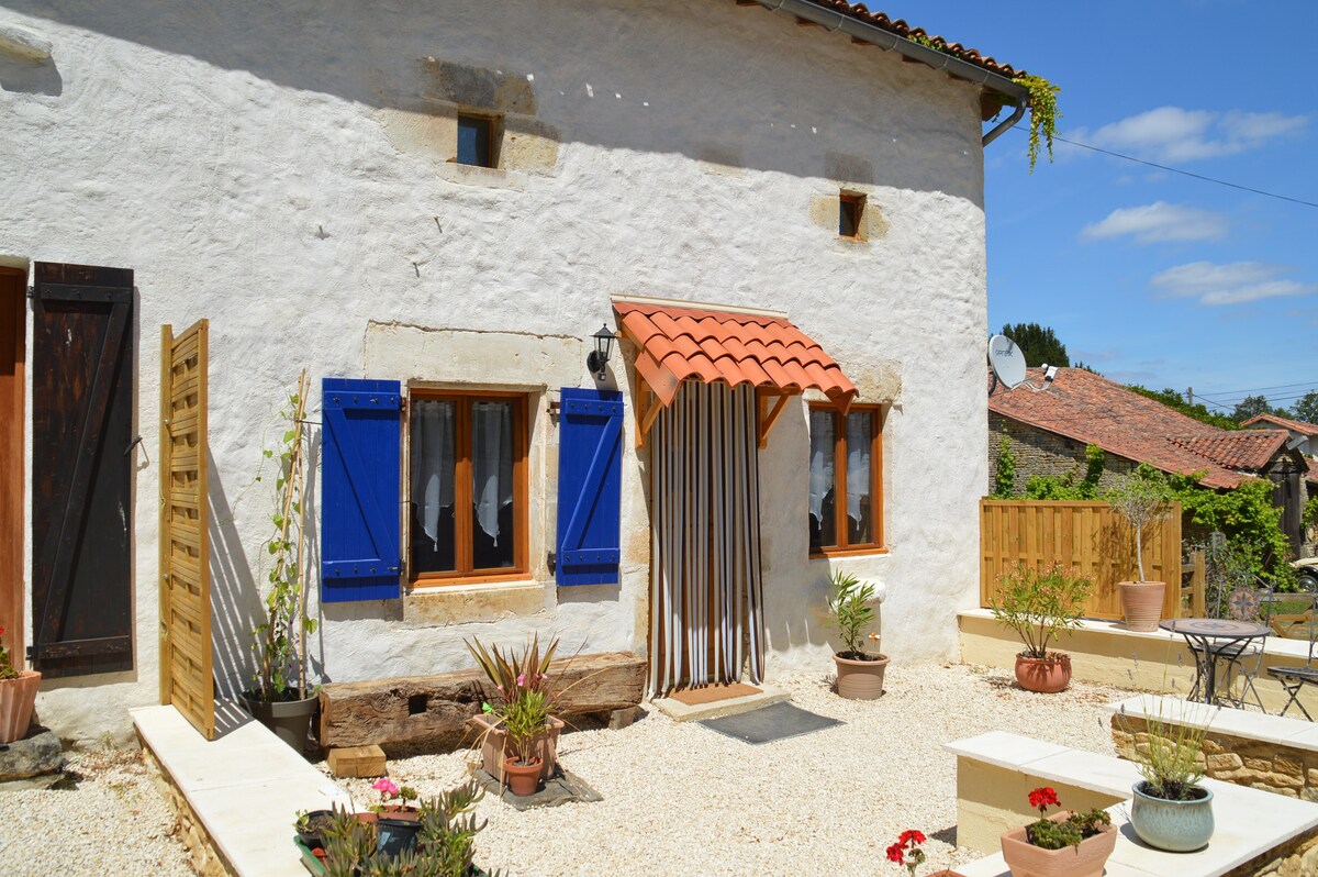 The Cottage is perfect for a back to nature holiday- but with a private Pool and Hot Tub. Peace and Tranquility-perfect for a couple to relax and enjoy Rural France. There are no other guests on the property. There are beautiful walks on the doorstep with a Medieval Millhouse on the Charente river 300 metres away and chemins stretching for miles around the area. The beautiful old Abbey Town of Charroux is 8 Kms distant and we are within half an hour of Civray, Ruffec & Confolens.