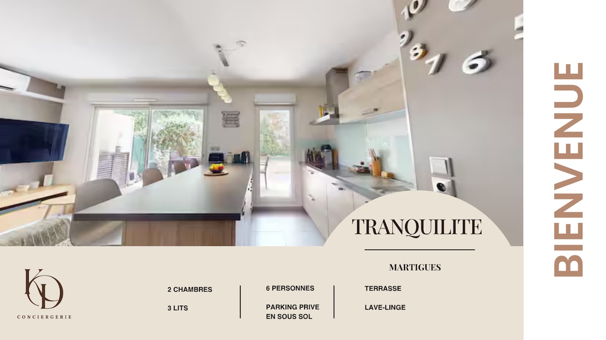 Enjoy this magnificent 47m2 apartment with free pkg space. It consists of 1 beautiful equipped US kitchen, a bright living room a beautiful terrace with garden overlooked. 1 bedroom with double bed & dressing room, 1 bathroom with toilet, sofa bed Close to all amenities, linens not provided 8 minutes from MagicLand amusement park 10 minutes from the beaches (Carry, Sausset, La Couronne...), Martigues, Ensues and its calanques. 15 minutes from the Airport and Aix TGV station 35 minutes from Aix 25 minutes from Marseille,