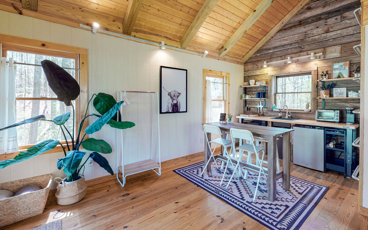 Relax in this peaceful, romantic retreat—perfect for a couple or small family. The elegant bedroom features a king bed and TV, while adult-size bunk beds offer a cozy space for reading or an extra guest. Enjoy a luxury tile shower, a full kitchen with major appliances, and main room with a wall of windows. Unwind on the private deck and take in stunning mountain views. A serene escape in the heart of nature.