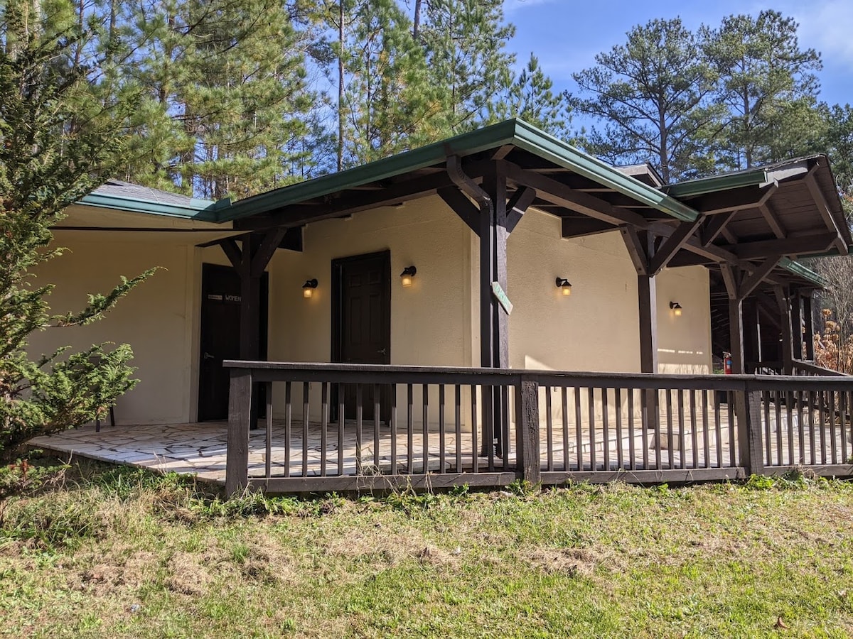 Located on 34 acres in the heart of Sumter National Forest, just 5 minutes from the Wild and Scenic Chattooga River, our rustic post and beam lodge, music loving tavern, 8 guest rooms and 17 creekside campsites will create memories that last a lifetime. Room 6 has one queen and is on the more social Courtyard Side. No private baths but the large marble bath house is steps away. All rooms have a rustic/lodge/mountain feel with vaulted ceilings, mini fridge, pod coffee maker and 40" tv.