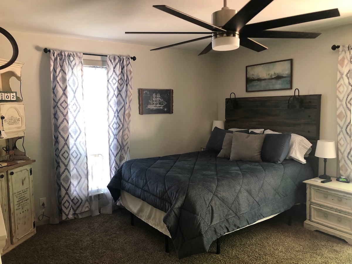Enjoy your home away from home. Your cozy suite has a spacious KING BEDROOM and a cozy fireplace living room. A luxurious spa bathroom with a deep soaking bathtub will soak away your stress. Your private keypad access and entrance will ensure your ability to come and go as you please. We provide a small fridge, microwave, and a coffee station with snacks for your convenience. Enjoy the porch swing right outside your room with your morning coffee. Enjoy our new fire pit upon request.
