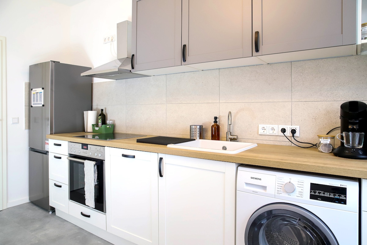 Here's your temporary accommodation, right in the heart of the city, yet close to nature – the Chemnitz Küchwald forest. • Fully equipped kitchen with complimentary coffee and tea • Several comfortable bedrooms for family or friends • A private balcony for fresh air and stunning views • Stylish sofa area with MagentaTV and Smart TV • High-speed Wi-Fi for work and leisure • Easy self-check-in • Public transport stops nearby