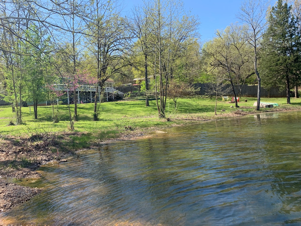 The Lilypad is a private, delightful two-story home on Kiwanie Lake just blocks from the Southfork of the Spring River. The home sits on an acre of land with a seasonal creek. Fenced and pet friendly (1), it is a great retreat for small or larger groups (9 max). Use our boats for fishing at the lake or enjoy local shuttle rentals on the Spring River. Hardy and Cherokee Village are each a 2 mile drive. Fill your days with the beauty of the outdoors and come home to play pool or enjoy a campfire.