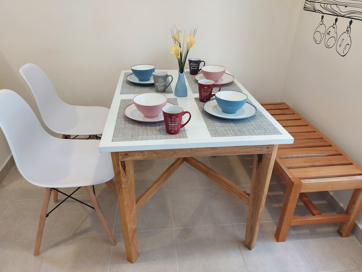 Very cozy and spacious apartment, fresh with new furniture, kitchen accessories and utensils, TV with WiFi to enjoy your favorite platforms. It has hammocks so you can bring your own hammock if you wish. Located in a very central area of the city with very easy access, it has nearby recreational spaces, regional food nearby, and grocery stores just 100 meters away.