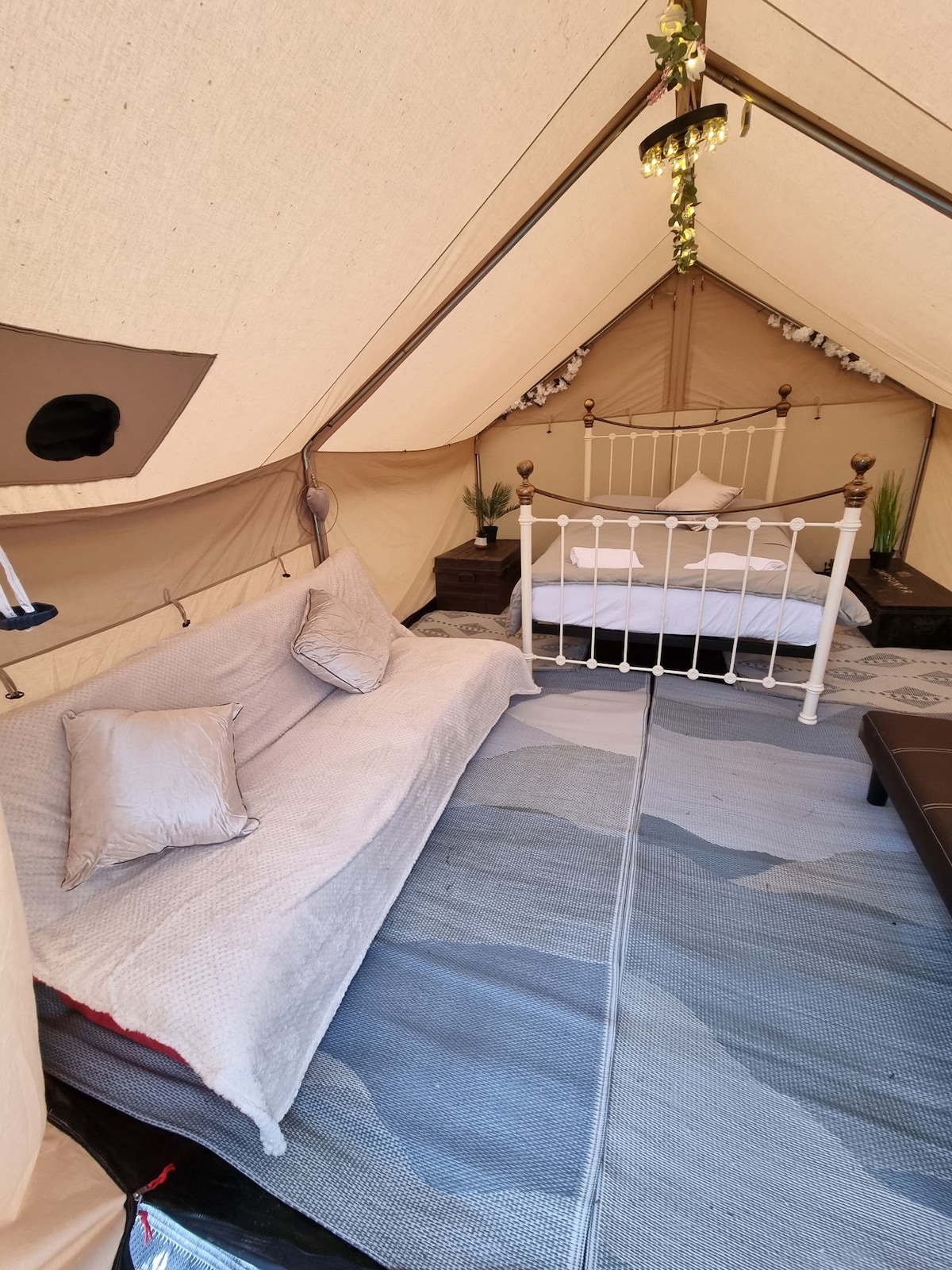 Enjoy nature in this romantic setting in either our Emperor, Prospector or Bell tent with lots of home comforts. There's fresh water on tap and homemade compost toilets. Meet our goats and chickens. We're far enough into the countryside to unwind and quietly observe the deer and wild birds, but close enough to Crawley to not feel too isolated. Gatwick is a short distance away if you want to stay just before or after a holiday, eliminating the worry of traffic and rushing to/from the airport.