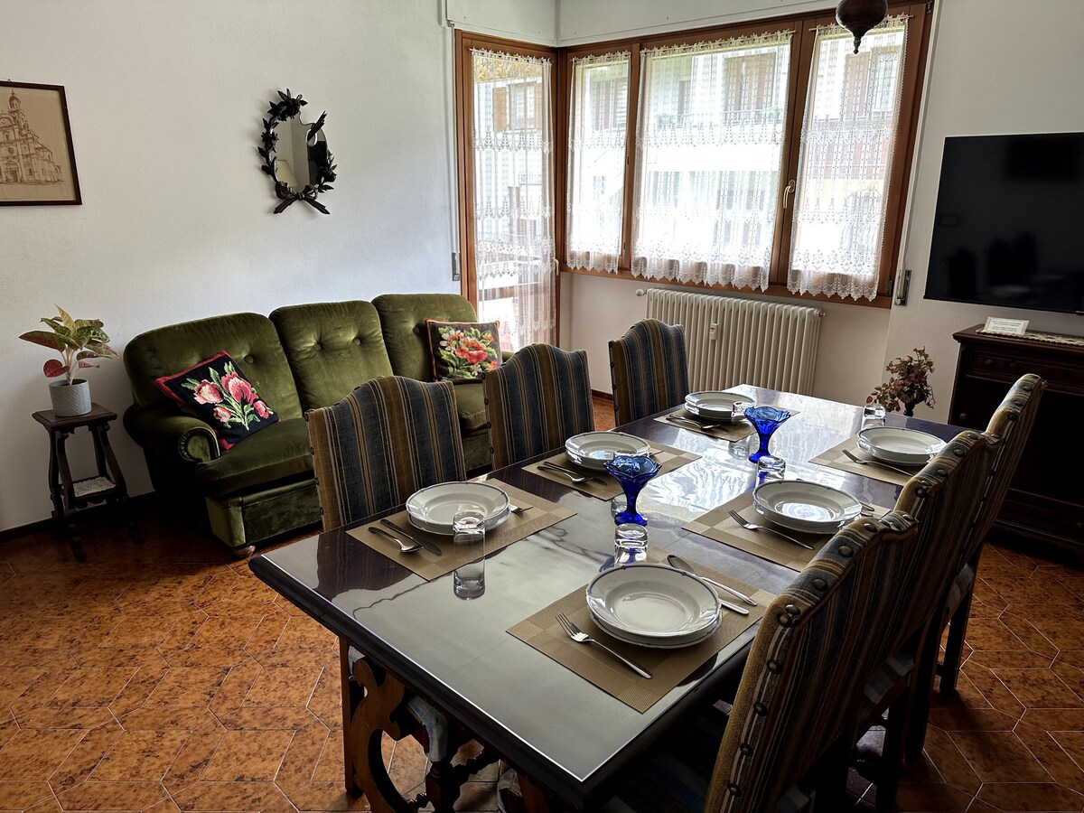 Apartment with 6 beds with view on the mountains. There are 2 bathrooms, both with showers and bidets. The common spaces are not very big, but well organized to eat together and relax. There are 2 terraces: one with mountain view and one on the back of the house with a spacious storage room. At your disposal with no additional cost: - bed linen and towels - washing machine - dishwasher - baby bed (on request) - wifi We speak: Italian, English, French and some Dutch